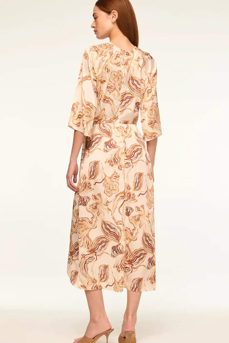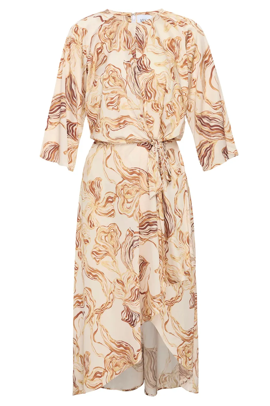 Our new Adina dress is a chic midi silhouette with three-quarter sleeves and a rounded neckline. Featuring a self-tie front that leads into a flattering faux wrap tulip skirt. Cut from our Golden Straw print satin, this style is the perfect desk to dinner look.