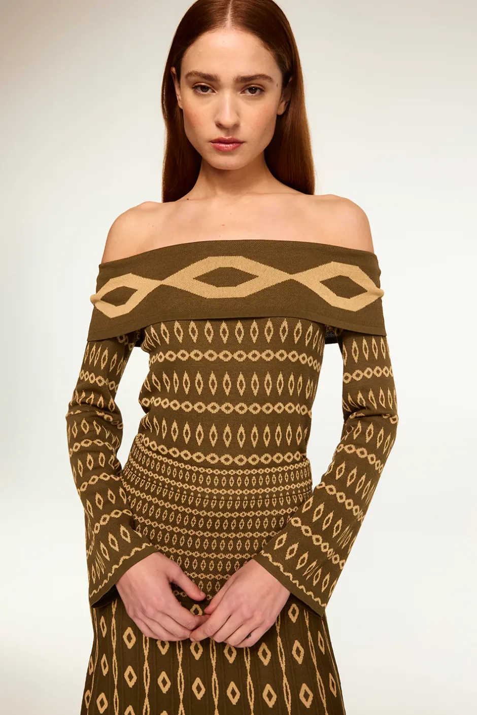 Our Alani knit top is an off-the-shoulder silhouette in a fitted rib knit geo printed jacquard. Featuring a fitted bodice and long, slightly flared sleeves. Pair with the coordinating Milani skirt for the perfect fall set.