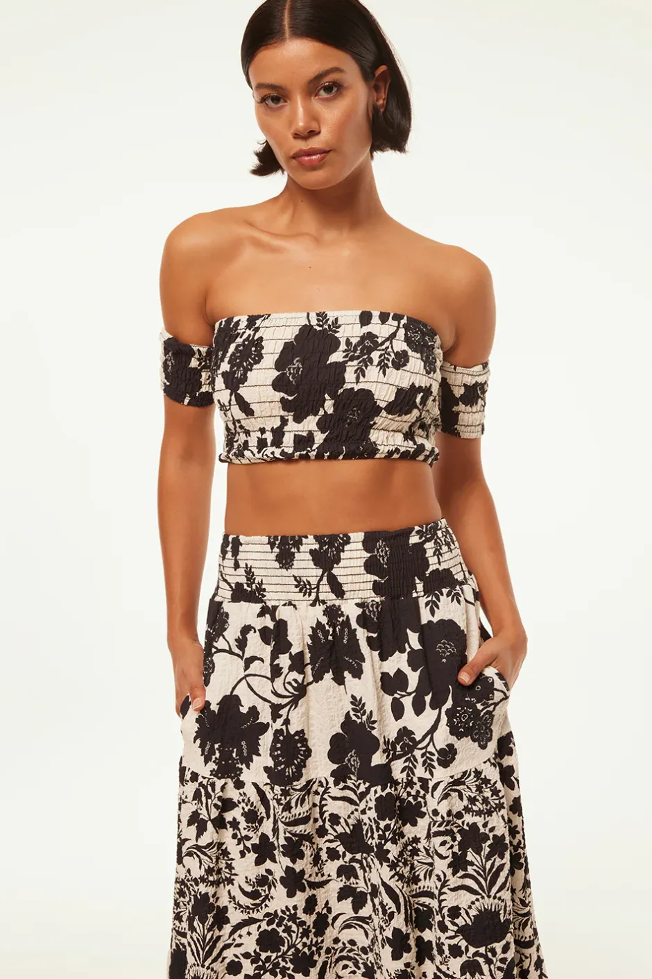 Our cropped Alba top is a smocked fitted bandeau with off-the-shoulder short sleeves. Cut in a bold black and white graphic flora crinkle cotton. Pair with the coordinating Yelena skirt for a set that is sure to turn heads.