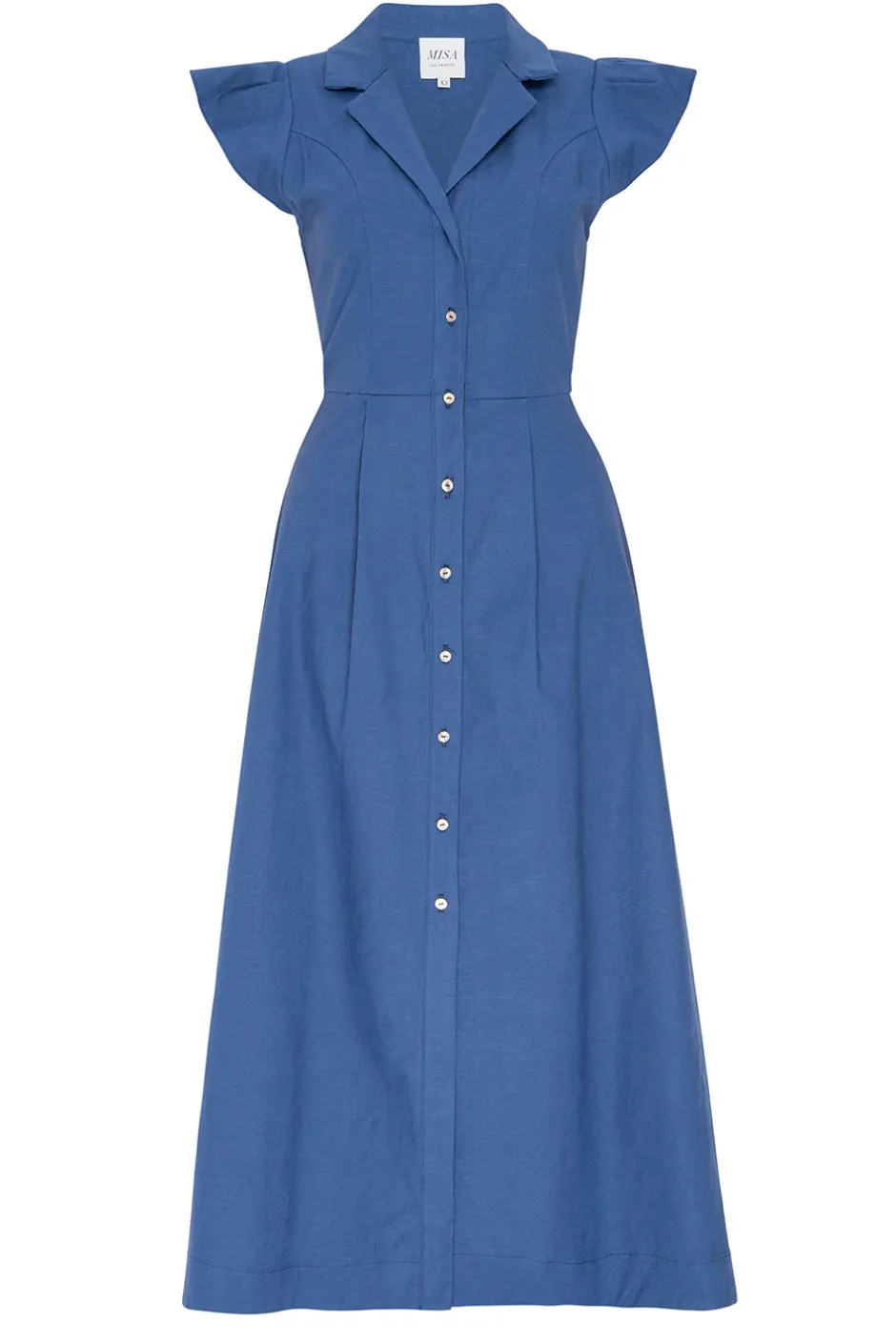 A closet staple you’ll turn to for years to come, our timeless Almaz midi dress is cut from a beautiful blue linen and features short flutter sleeves, a v neckline and notched collar. A flattering a-line silhouette with full button placket and side slit pockets. Style with easy flat sandals for a daytime look or dress up with heels.