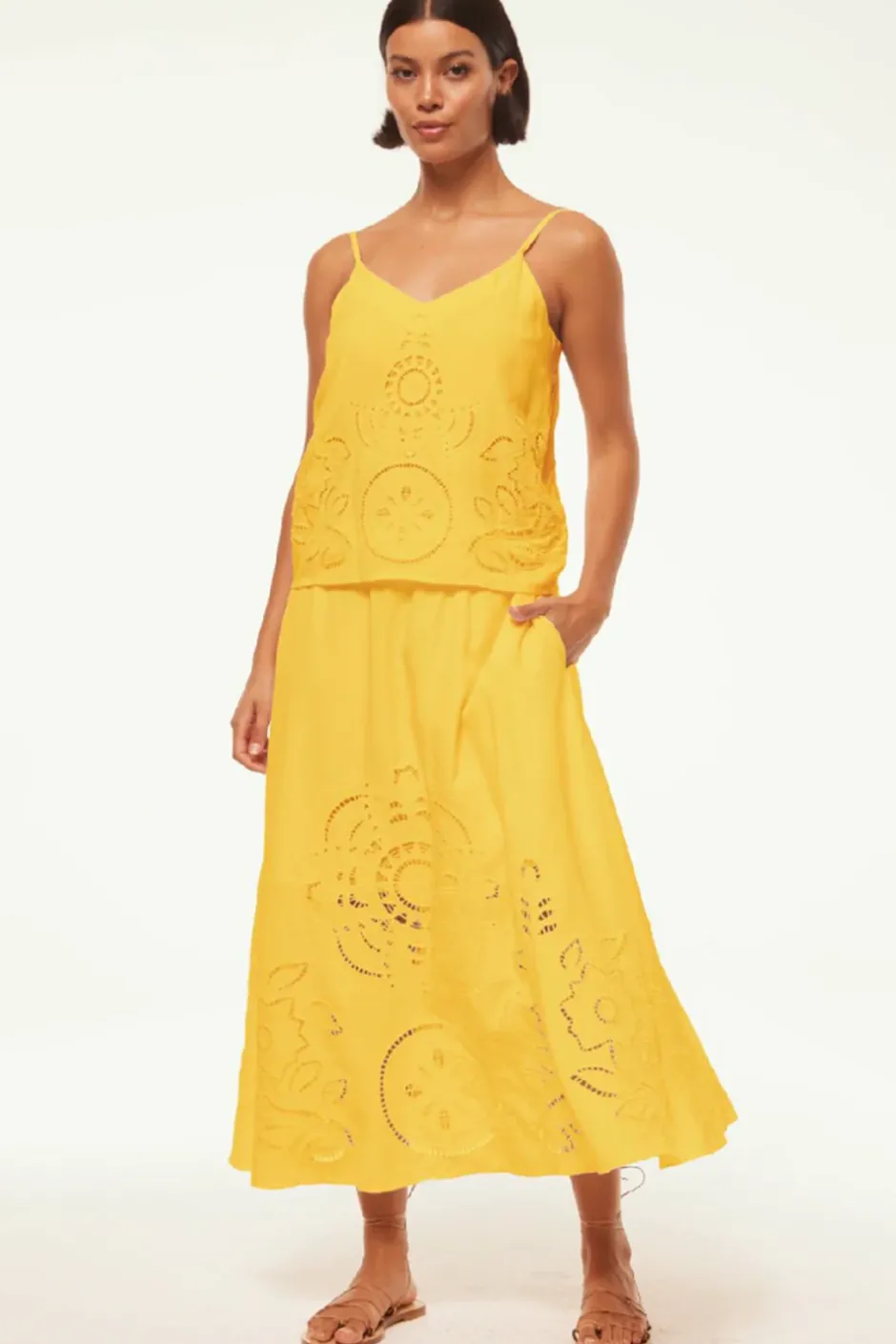 Our Analisse midi skirt is an easy a-line silhouette cut from a vibrant canary yellow cotton, perfect for Spring through Summer. Featuring an intricate floral hand-embroidered eyelet design around the middle and hem of the skirt. A comfortable elastic waistband and double side slit pockets. Pair with the coordinating Marcela camisole for a mood-lifting set in our favorite color.