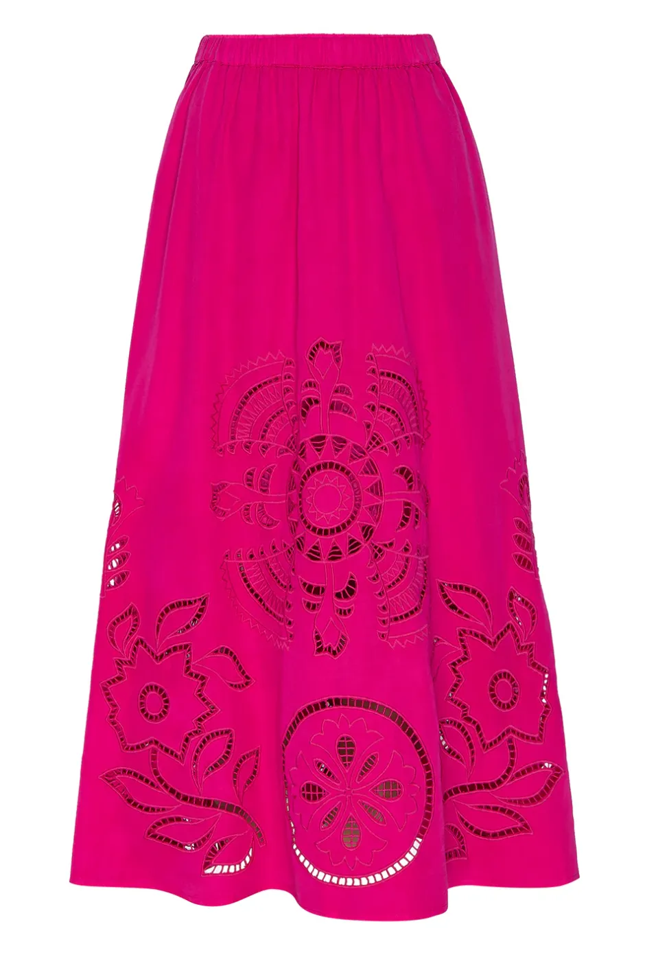 Our Analisse midi skirt is an easy a-line silhouette cut from a vibrant pink cotton, perfect for Spring through Summer. Featuring an intricate floral hand-embroidered eyelet design around the middle and hem of the skirt. A comfortable elastic waistband and double side slit pockets. Pair with the coordinating Marcela camisole for a mood-lifting set.