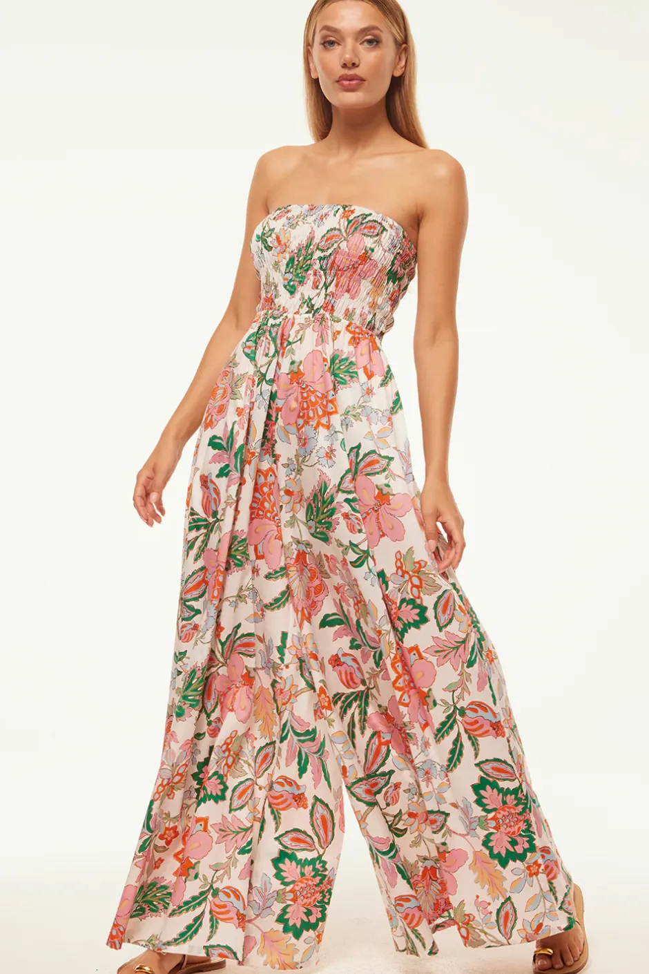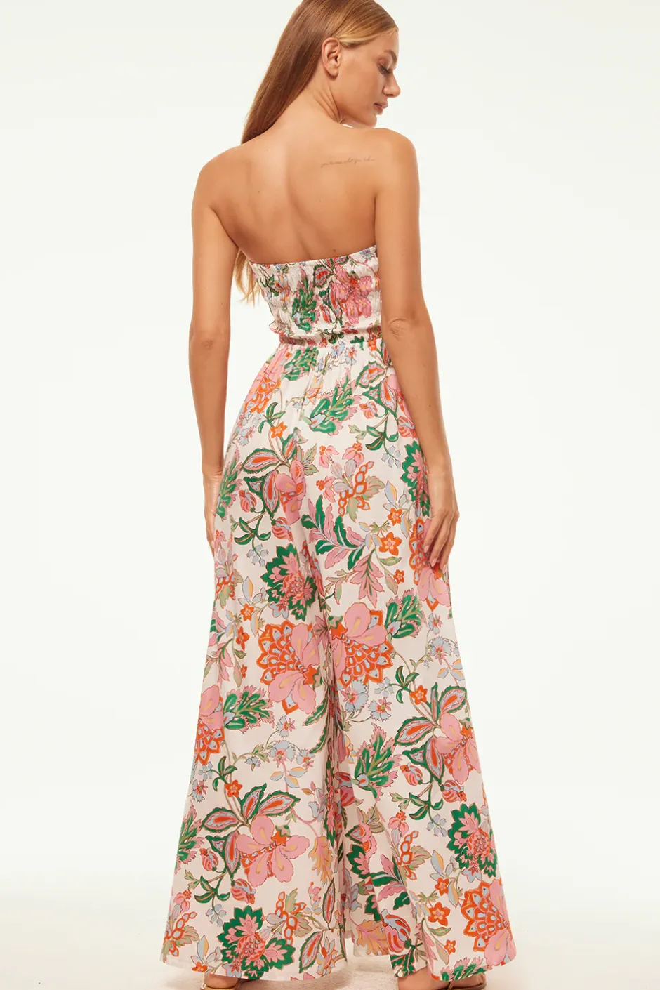 Our best-selling Andrea jumpsuit is back in a stunning Spring Casablanca Floral cotton poplin. This strapless wide-leg style features a flattering smocked bodice and side slit pockets. Pair with sandals or dress up with heels.