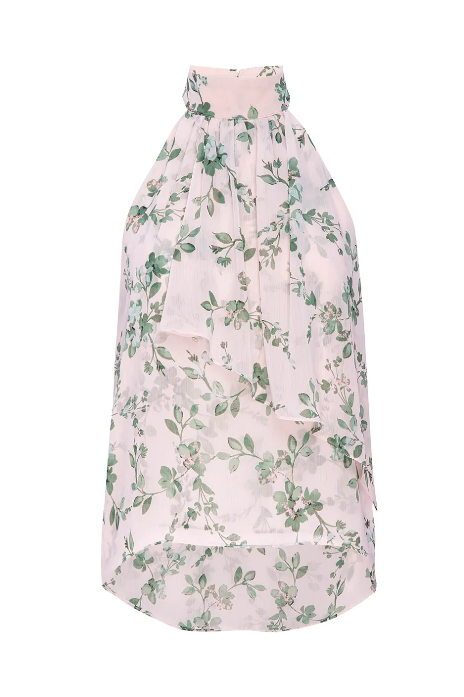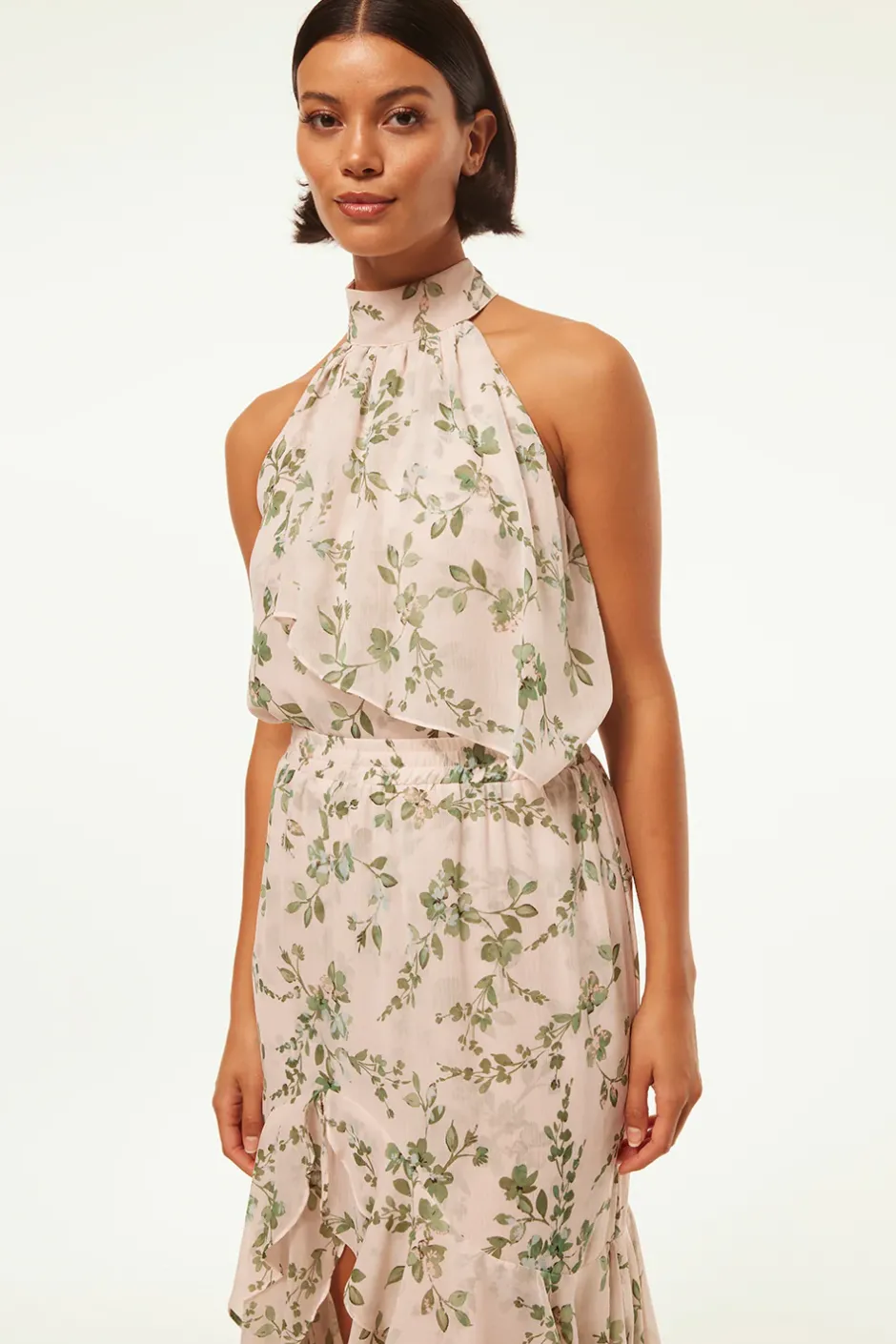 Our Anka top is cut in chic layers of sage botanical print on a warm ivory chiffon ground. This sleeveless halter top features a high neckline with back button closure. An effortless and feminine blouse to pair back to the coordinating Seva skirt for a chic set or dress down with denim.