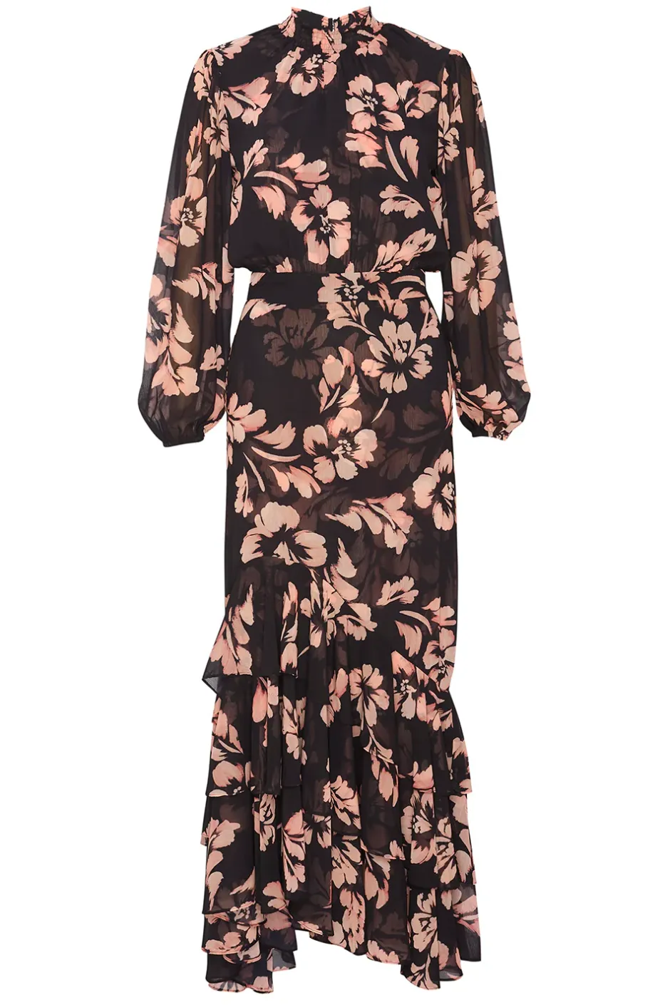 Our Audrey dress is a stunning new maxi cut from our Auric Flora print chiffon. Featuring a trumpet skirt with tiered flounces and a slightly high low hem. Pail pink florals on a black ground. A high neckline with a keyhole button back closure leads into voluminous sheer sleeves with elasticated cuffs. This standout style can be worn with boots for a full fall look or with strappy heels for the perfect guest of style.
