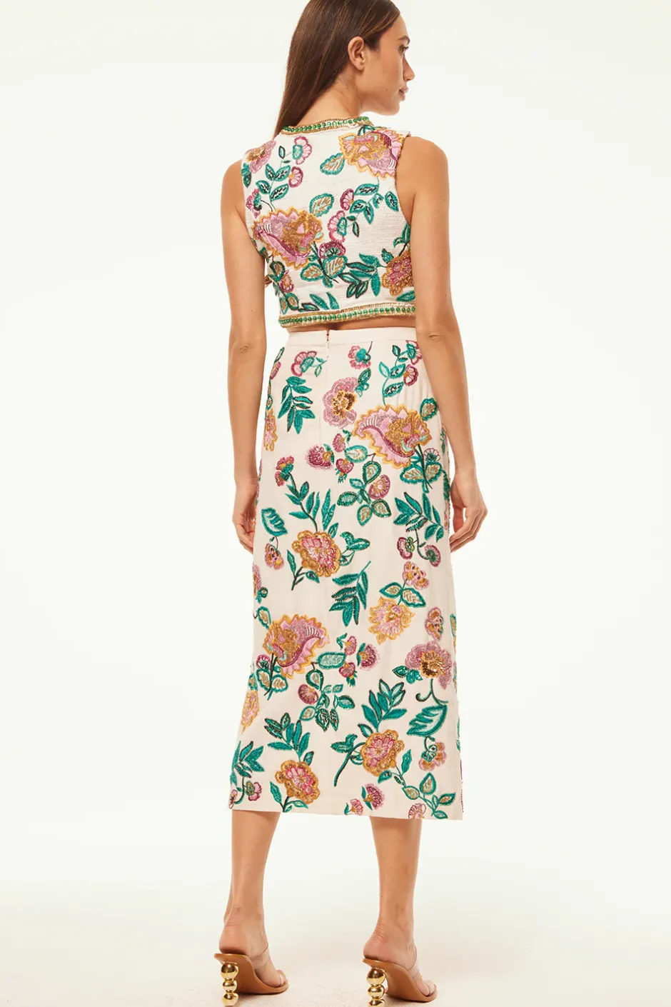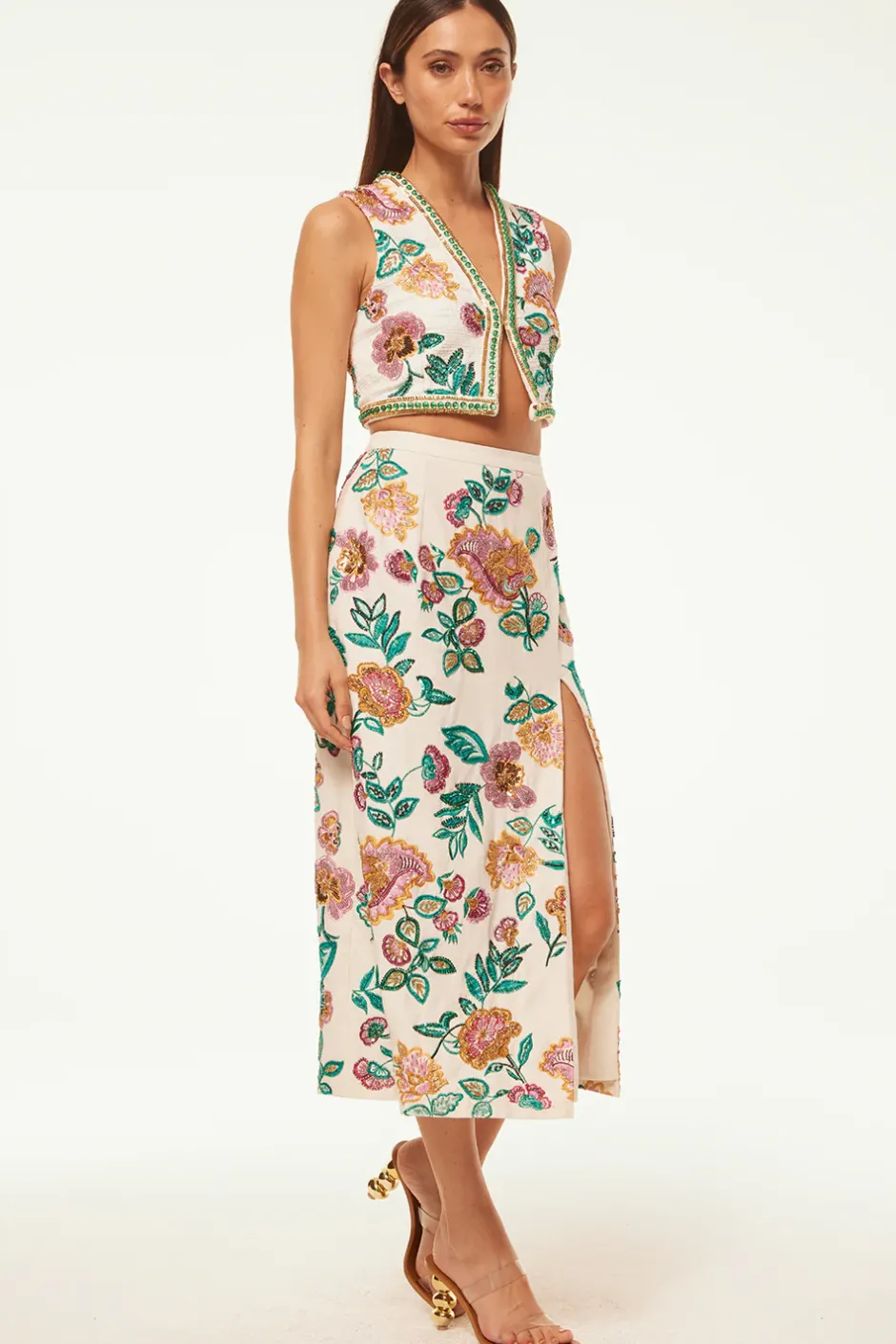 Make in a statement in our newest Bashira vest. Intricate floral hand beading adds dimension and fine detail to this stretch textured cream top. A deep v neckline and hook clasp front closure. Style with the coordinating Thema skirt for an ultra chic head turning look or dress down with denim.