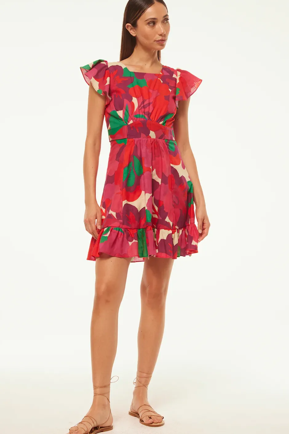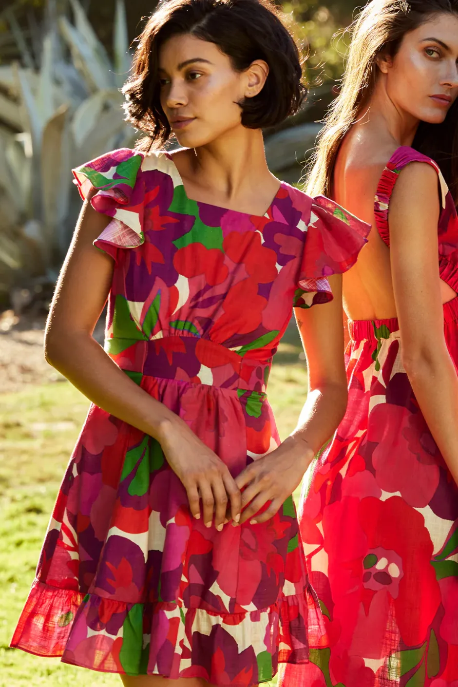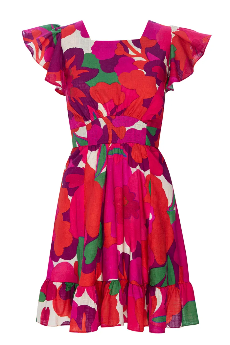The sweetest mini dress handcrafted in a vibrant Flora Rosada print cotton. This feminine dress features a square neckline with ruffles sleeves. A gorgeous open back is finished off with a double bow-tie detail. A partially elastic waistband leads into a ruffle trimmed skirt. Pair with your favorite sandals for an effortless daytime look.