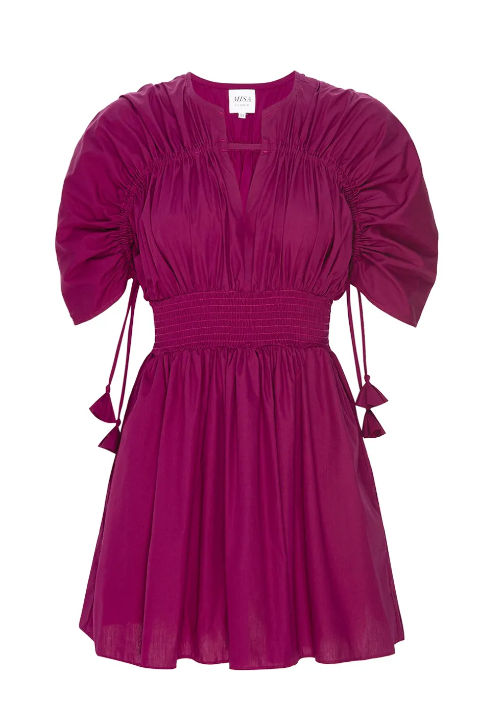 Camila is an effortlessly chic mini silhouette. Handcrafted from an orchid cotton poplin, this mini dress includes dramatic puffed dolman sleeves with adjustable string tie ruching detail and a v-neckline with keyhole bodice. A comfortable elastic waistband leads into a mini skirt with slide slit pockets on each side.