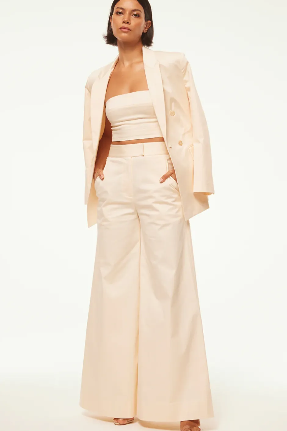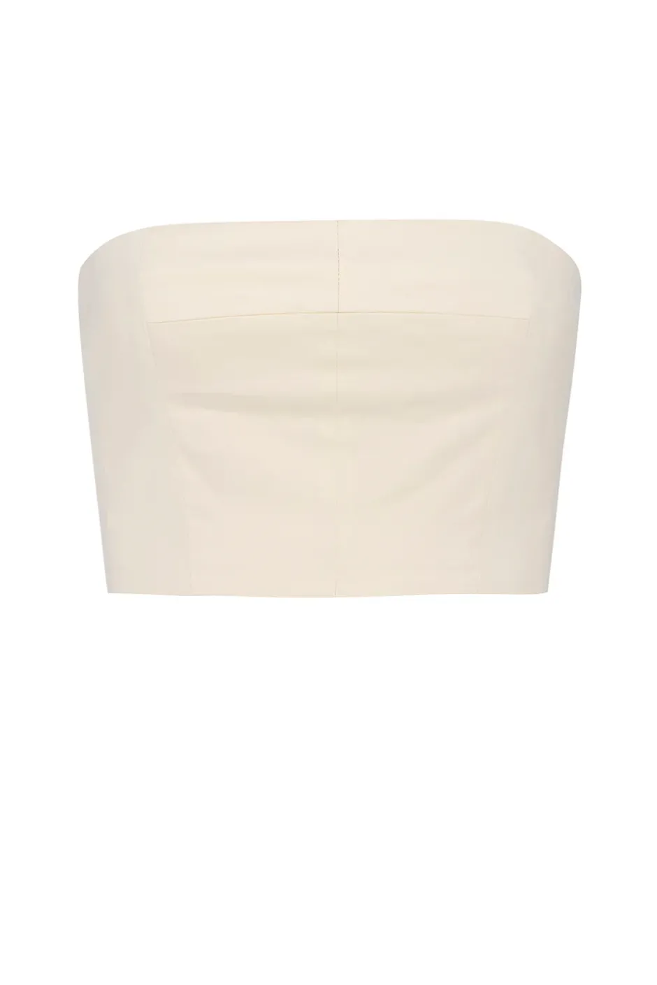 Our candy bandeau is an easy layering piece for your Spring wardrobe. Fitted and slightly cropped with just the right amount of structure in a stretch cotton fabric. Featuring a back zip closure. Shown with the coordinating Nico pant and Viva blazer.