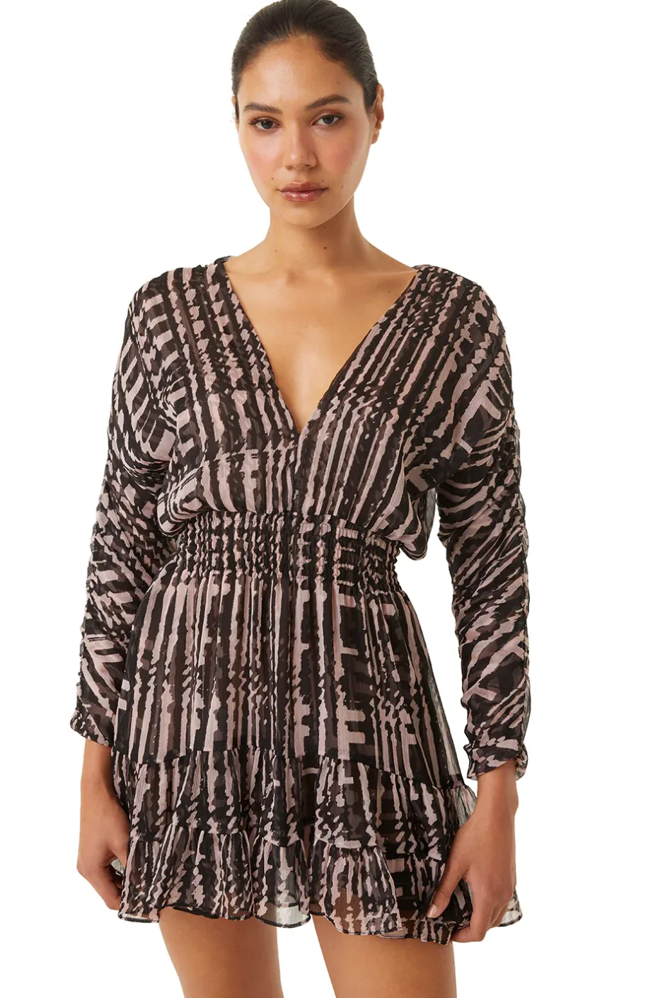 The Chiara dress is a mini-length update to one of our classic silhouettes cut from a chic pale mauve and black abstract print chiffon. Featuring a deep v-neckline and long blouson, ruched sleeves. A flattering smocked waist leads into a mini skirt with a double ruffle, slightly curved hem.