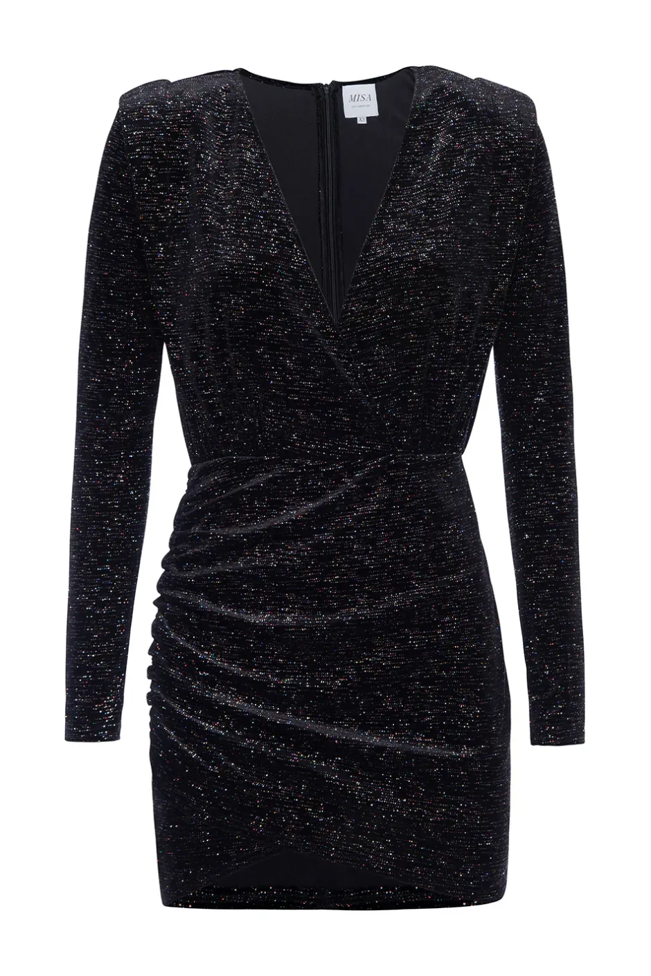 Diviana is a long sleeve body conscious mini dress cut from glittering metallic knit fabric. A faux wrap bodice with deep v neckline leads into a ruched asymmetric fitted skirt. Shoulder pads give the perfect amount of structure. Pair with a glittering heel for for the perfect holiday party look.