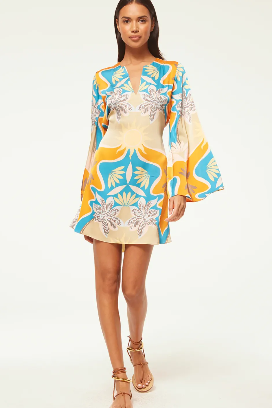Our new Dusty satin tunic dress is an a-line mini that features a vibrant Bain de Soleil motif, a v-neckline and long flared sleeves. Can be worn with or without the self-tie belt. Pair this Summer-ready style with everything from flat sandals to an espadrille wedge.