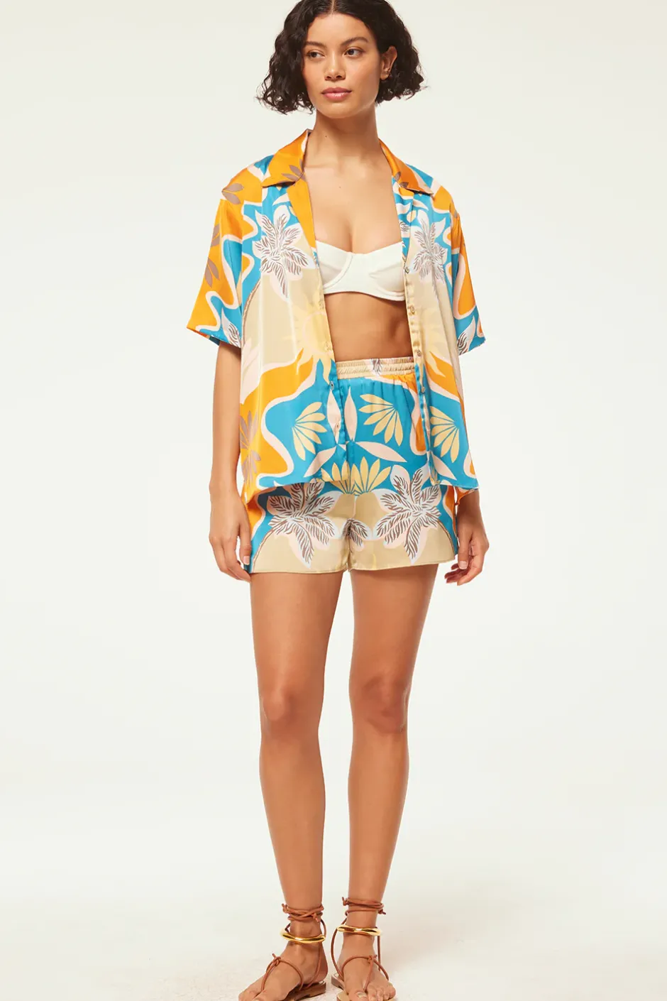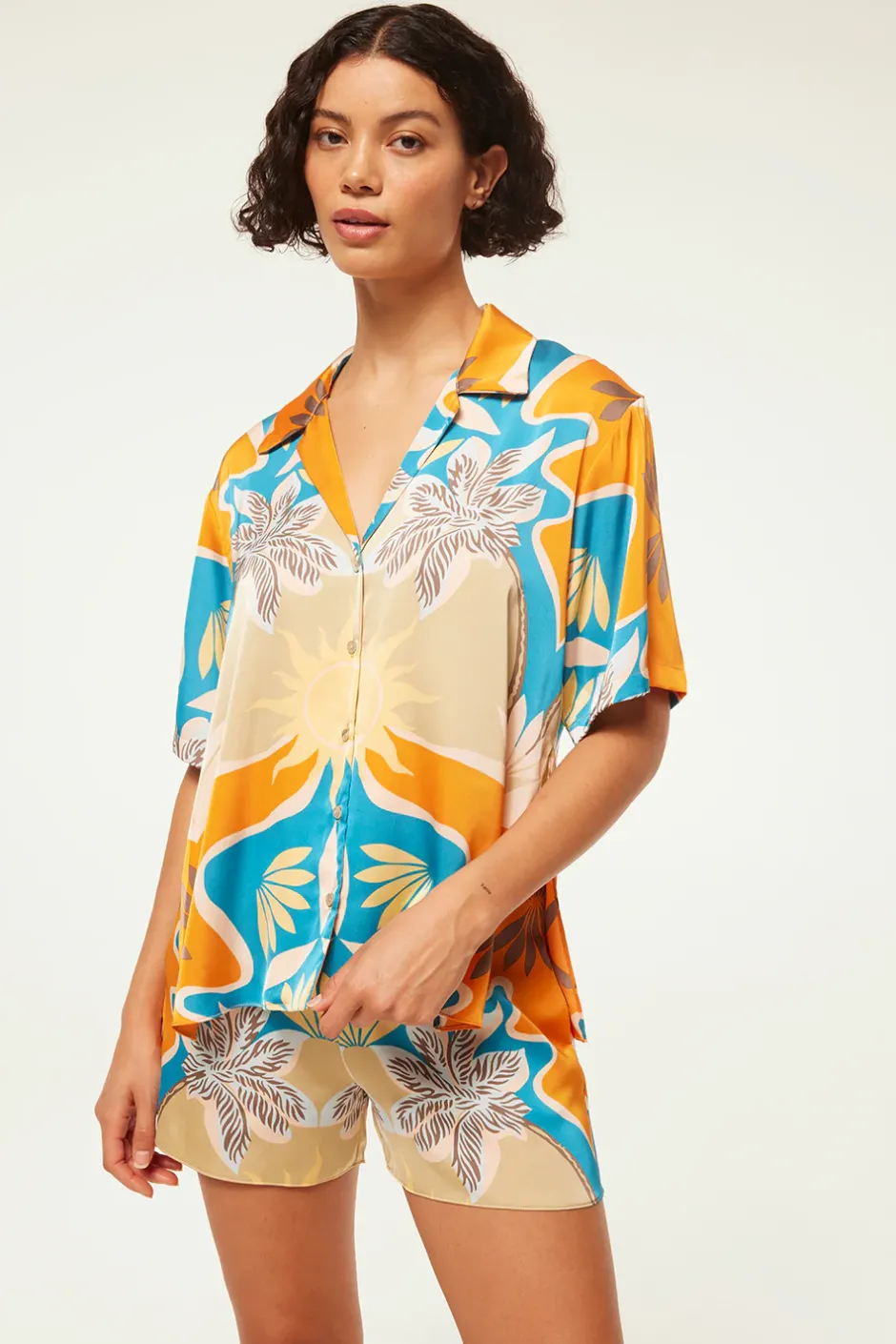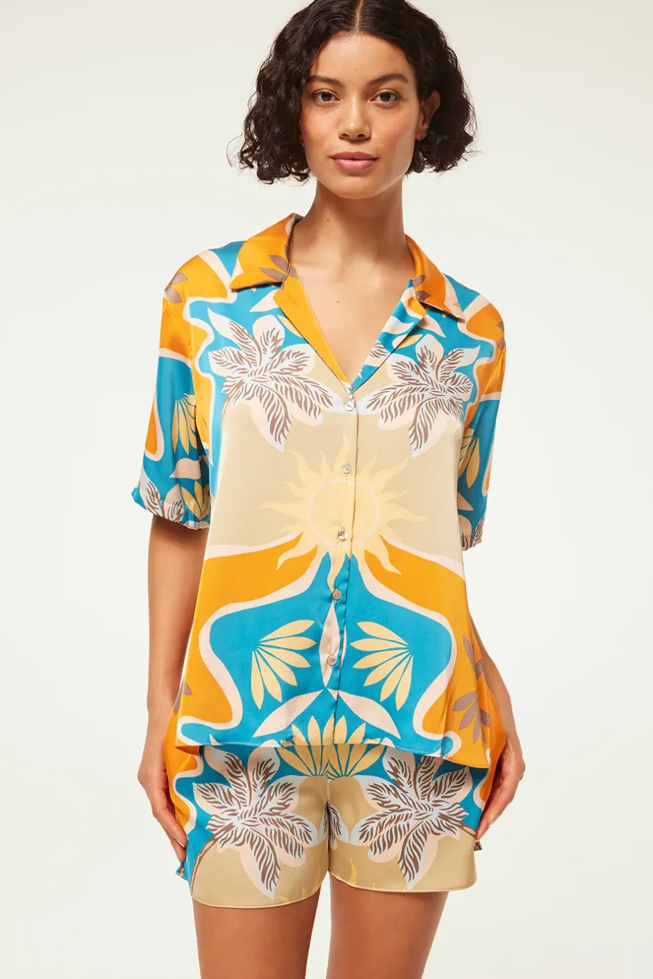 Elam is an easy satin short cut from a Bain de Soleil motif. Featuring double side slit pockets and a comfortable covered elastic waist. Pair with the coordinating Solange top for a head-turning poolside set.
