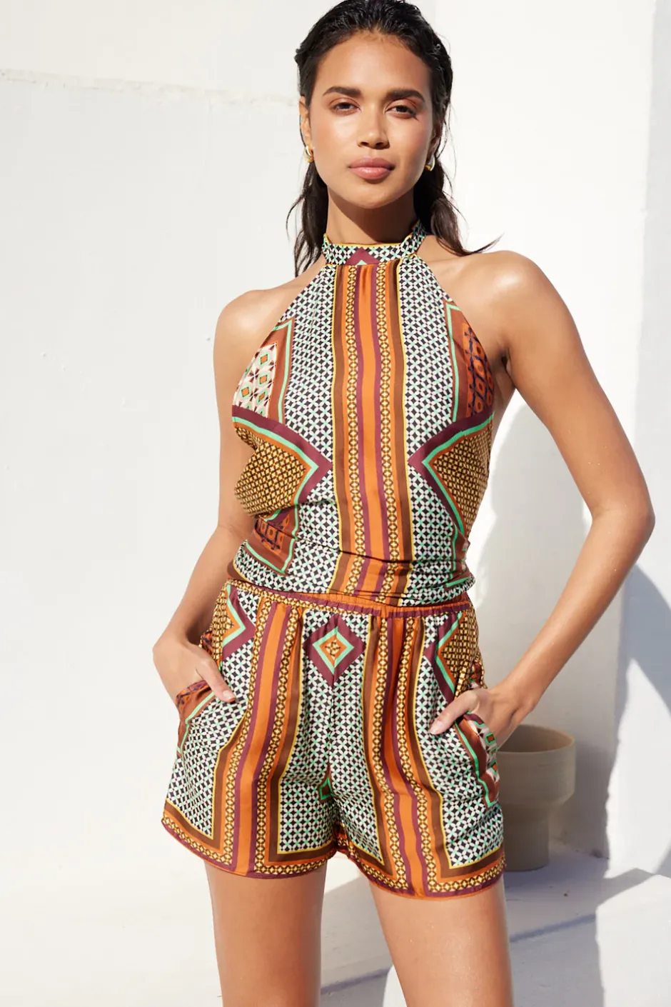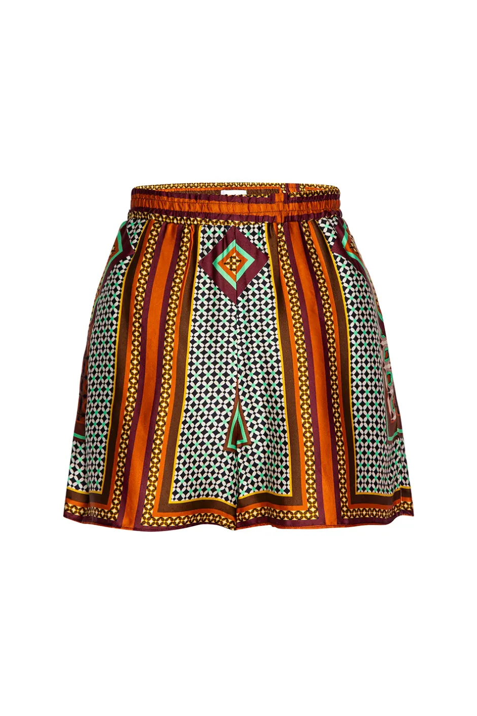Elam is an easy short cut from a Positano Scarf printed viscose. Featuring double side slit pockets and a comfortable covered elastic waist. Pair with the coordinating Isme or Ora top for a head-turning summer set.