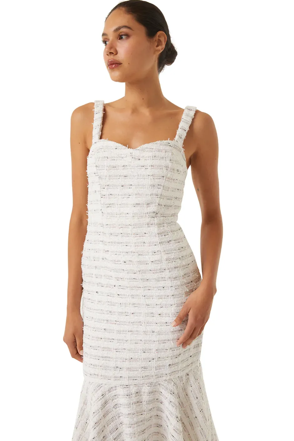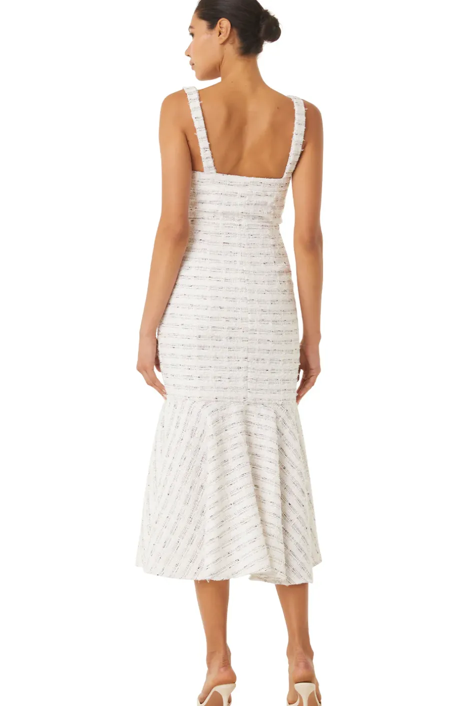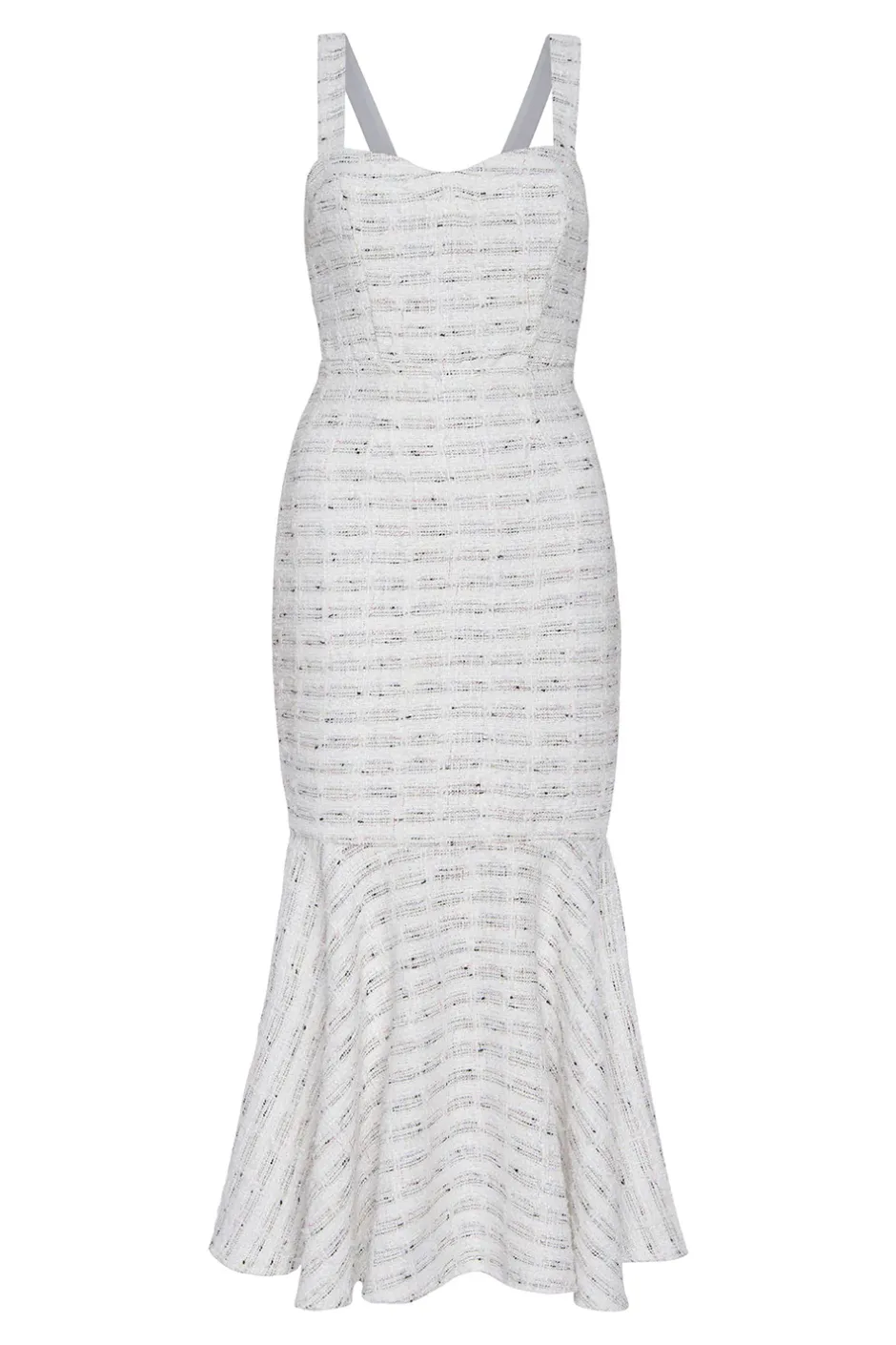 The Elke is a gorgeous winter white tweed boucle midi dress with shimmering metallic woven details. Complete with a sweetheart neckline and a fluttering trumpet skirt. Hidden side zipper detail. Style with the coordinating Penny blazer for a chic set.