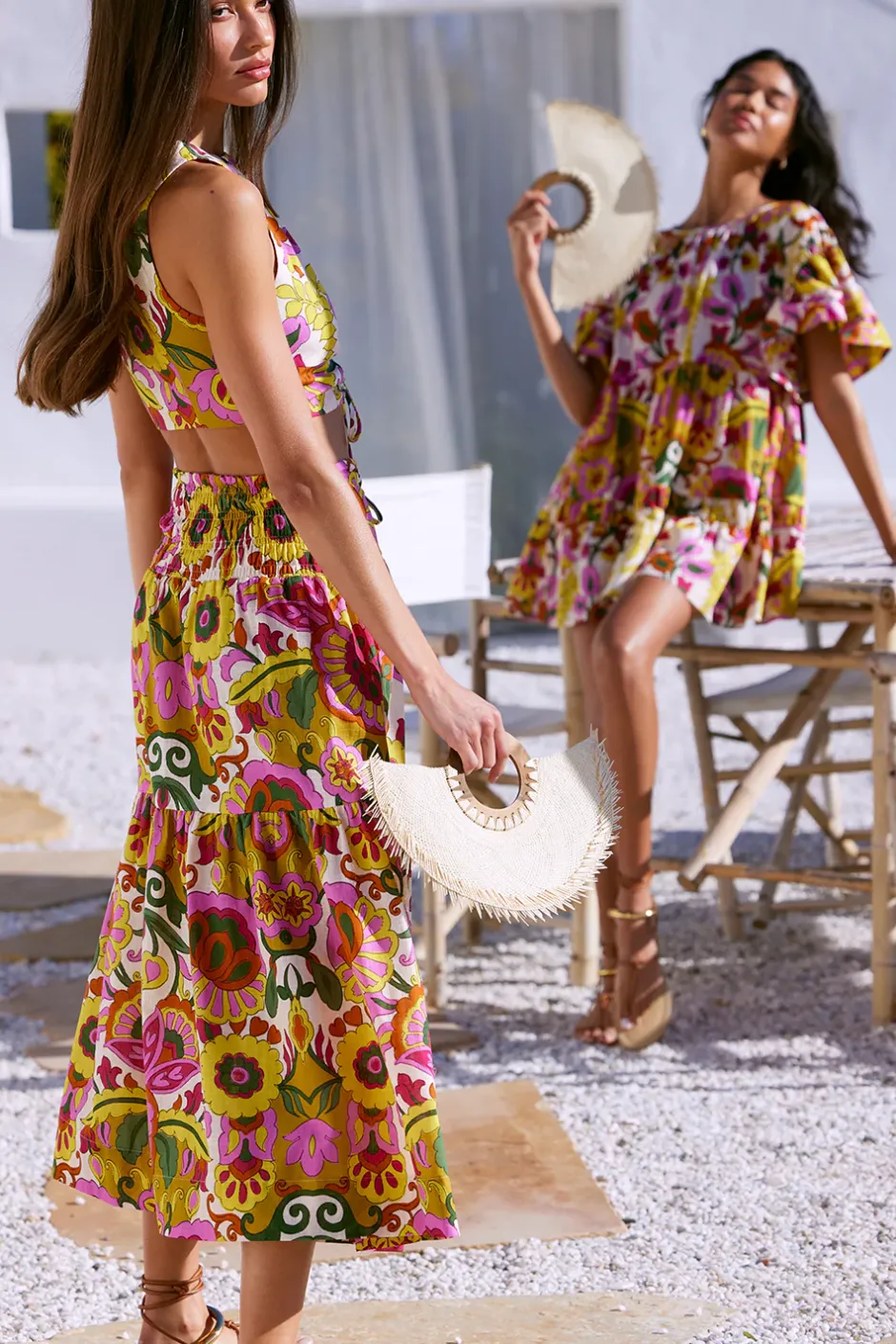 Cut from a groovy flora print cotton, Ellen is a chic and playful midi skirt for summer and beyond. The flat front waistband is smocked in the back and highlighted by an adjustable keyhole tie with our signature petal tassel ties. Pull on style. Tiered midi length. Pair with the coordinating Tanzia top for a standout summer set.