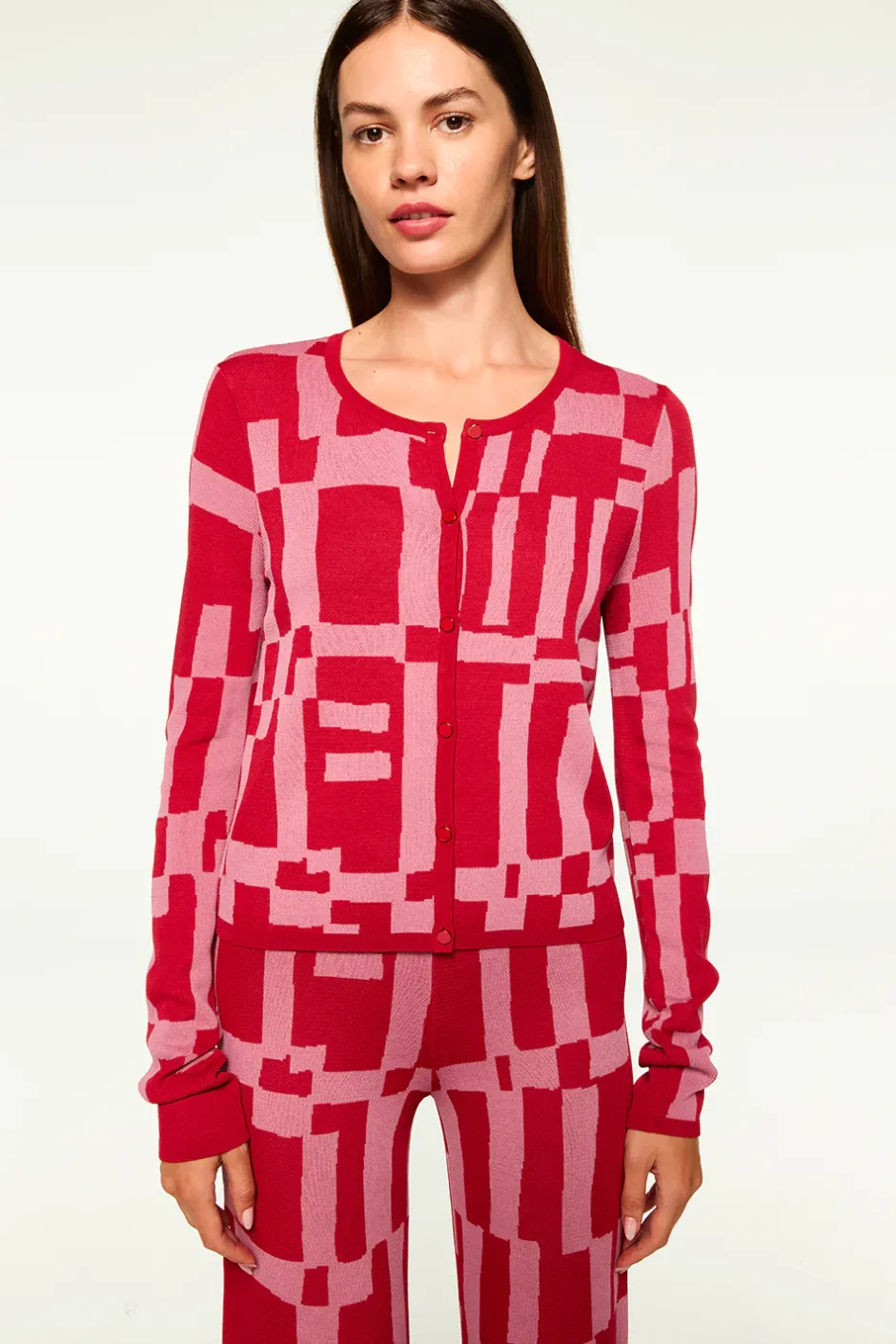 Elvin is a chic stretch knit cardigan in a two-tone red and pink geometric pattern. Featuring a round neckline, long sleeves and red enamel buttons. Pair with the coordinating Koa pant for a bold set. Wear alone or on top of the coordinating Una camisole.