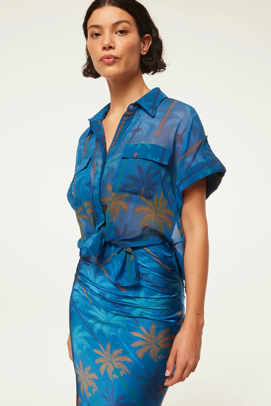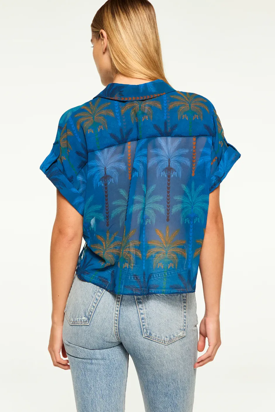 Erin is the epitome of effortless chic in a cobalt palms printed chiffon. This sheer, boxy silhouette features short rolled sleeves with epaulets. A covered front button placket and fold-over collar with double chest pockets is finished off with a curved hem. Wear this easy style as is or tie it in the front for a summer-ready look.
