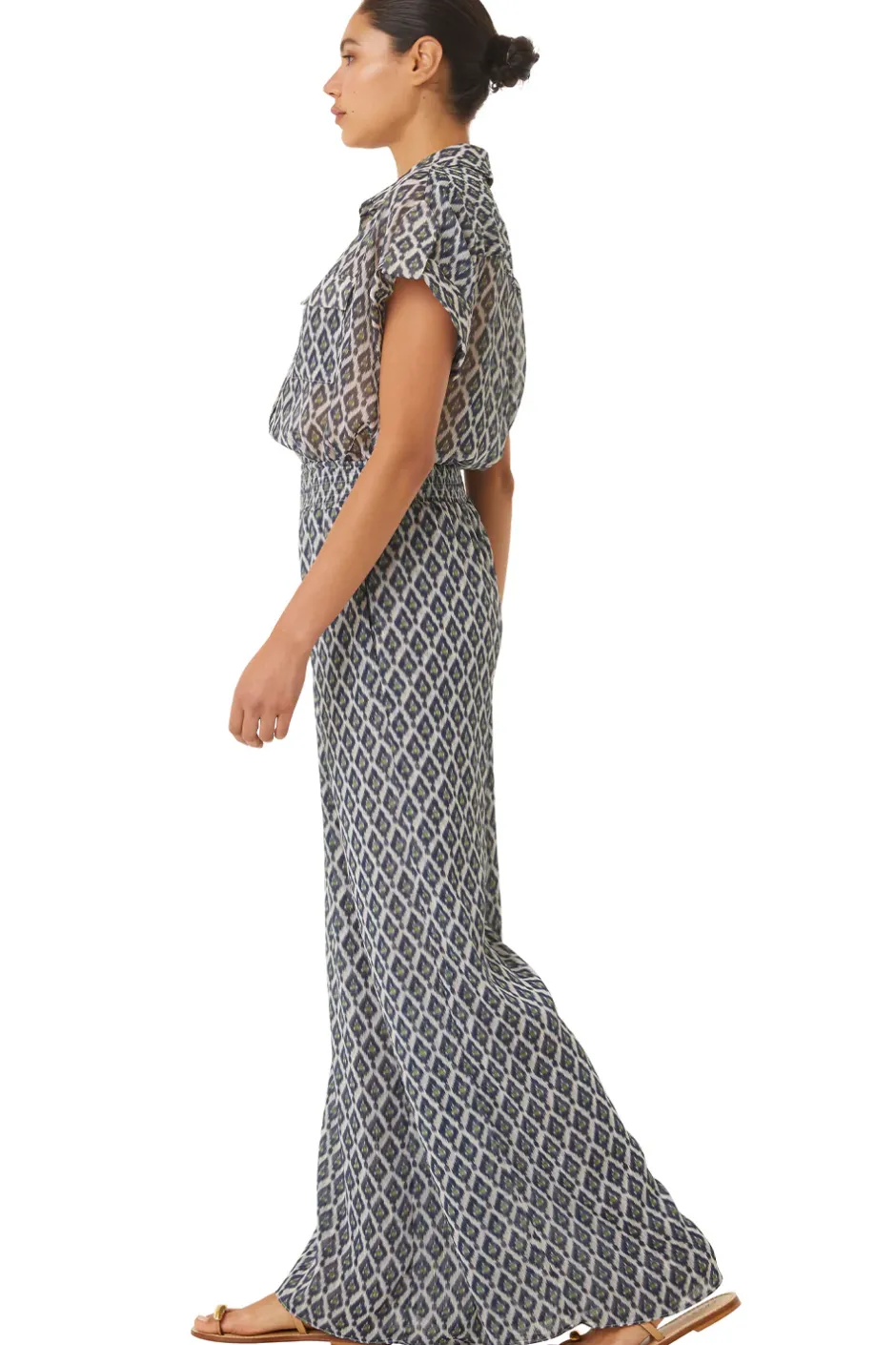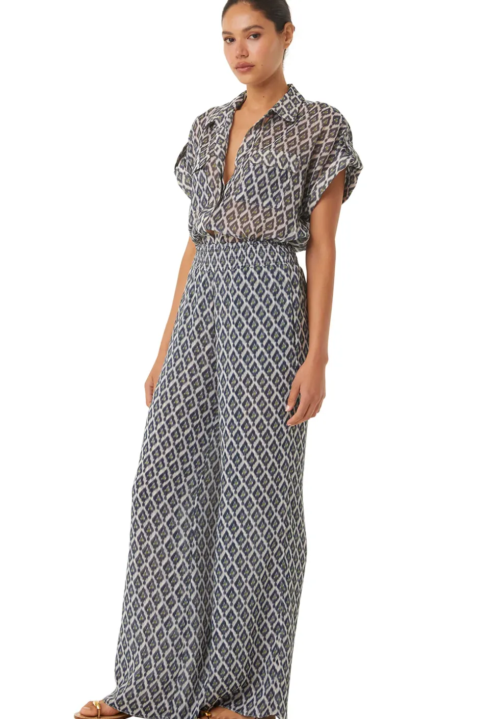 Erin is the epitome of effortless chic in beautiful peridot eyes print with lurex details throughout. This semi-sheet boxy silhouette features short rolled sleeves with epaulets. A covered front button placket and fold-over collar with double chest pockets is finished off with a curved hem. Pair with your favorite pair of jeans or the coordinating Freda pant for the perfect set.