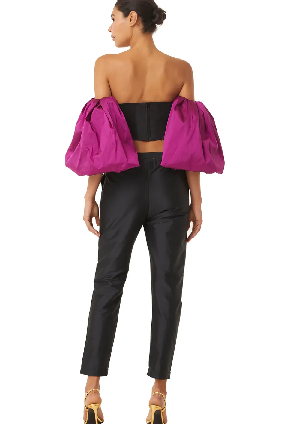 Our Georgina pant cut from black taffeta, feature a tailored fit for a truly sophisticated style. A flattering elastic waistband and double side slit pockets. This cropped style is the perfect wardrobe staple to pair with all of our tops. Pair with the Dita top for a head-turning holiday set.