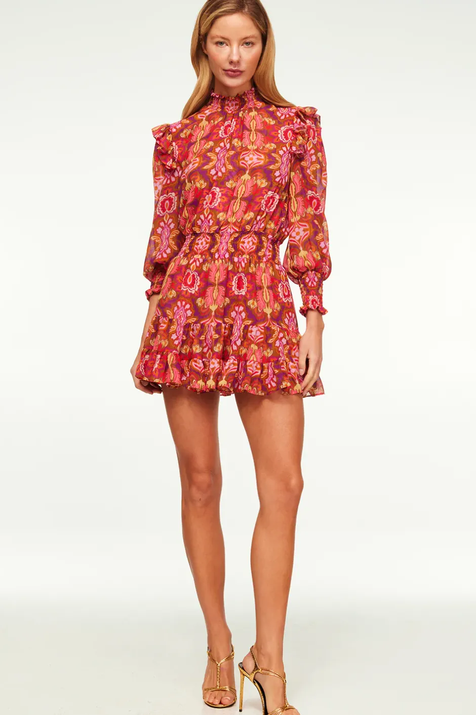 Gianna is an effortless mini silhouette handcrafted from a Chic Nostalgic printed chiffon in vibrant hues. This sophisticated style features a high, smocked neckline, long blouson sleeves with cuffs, and an elasticated waistline that leads into a tiered ruffle trimmed mini skirt.