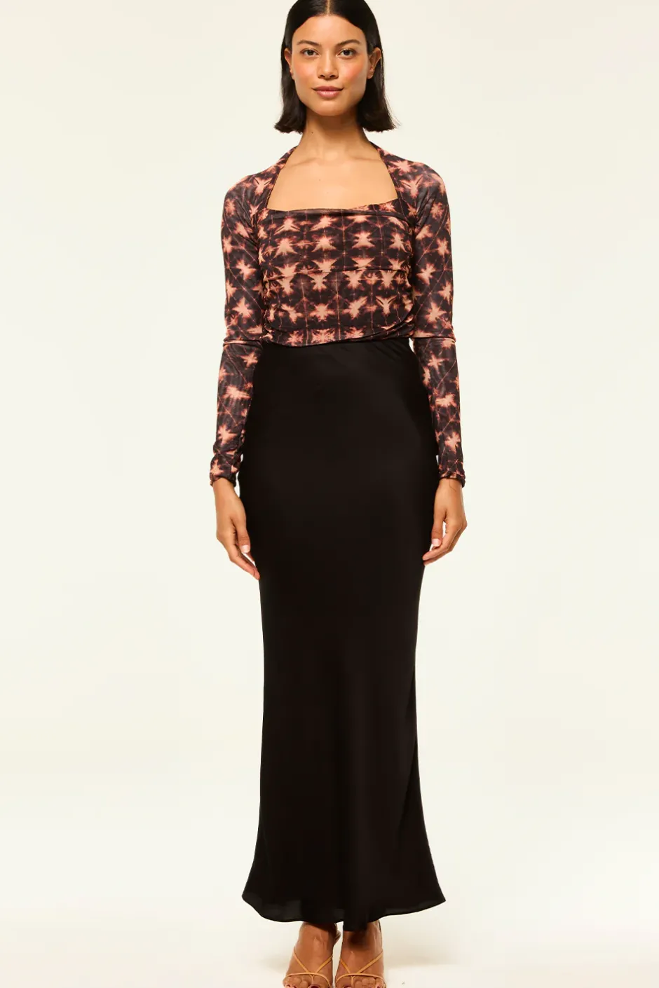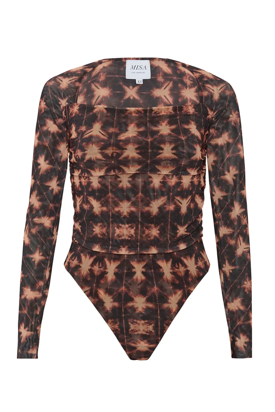 Our newest Hayworth bodysuit is back for fall in a gorgeous Angel Glow tie-dye print. Long sleeves and a flattering square neckline show off your collarbone and ruched stretch mesh hugs and flatters your curves. A snap-button bottom closure and thong back. Pair with your favorite pair of jeans or with our Sierra skirt in black. For a standout look wear with the coordinating Ekat skirt.