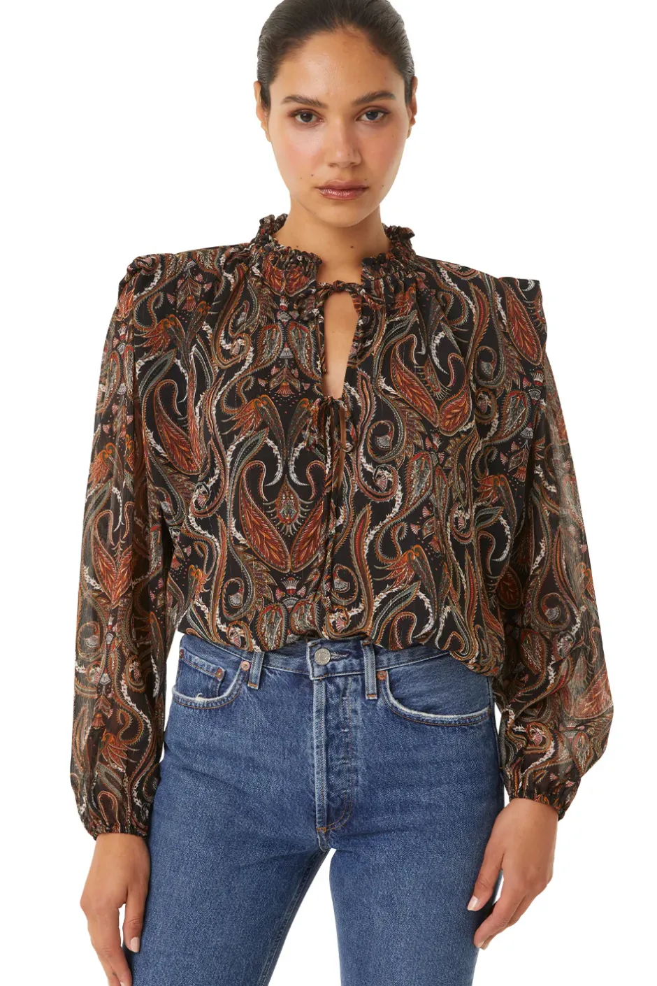 Helena is a beautiful chiffon blouse cut from a sparkling lurex paisley print. A split neckline with ties and a ruffle detail at the collar. Long puff sleeves lead into cinched cuffs. A ruffle stand detail at the shoulder gives a structured appearance. Our new favorite top pairs perfectly with jeans or dress up with our satin Filippa pant.