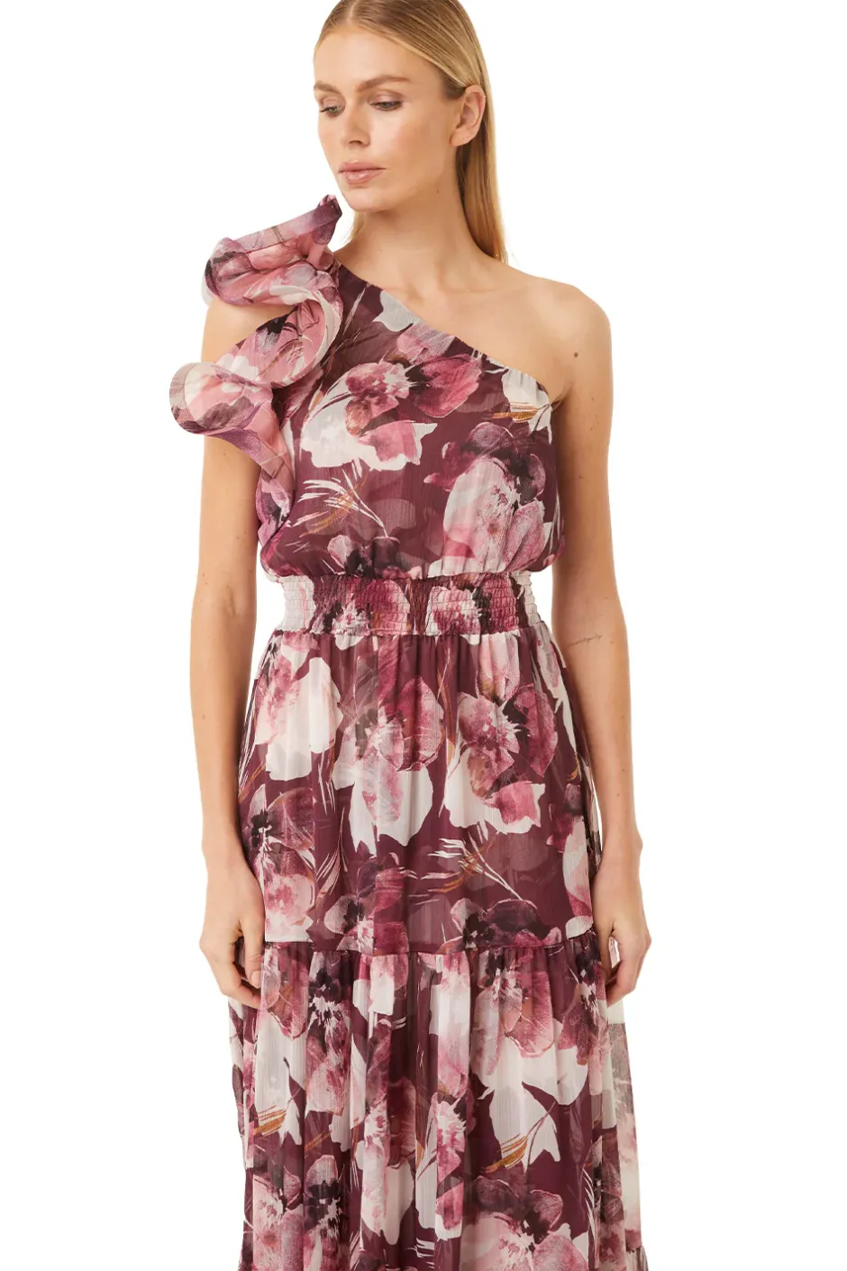 Ilaria is a gorgeous event-ready silhouette cut from a beautiful Flora Tropical print chiffon. This tiered one-shoulder maxi silhouette features a dramatic structured ruffle detail at the shoulder. A covered elasticized waist is comfortable and figure-flattering. Pair with a barely there heel and sleek bun for elevated elegance.
