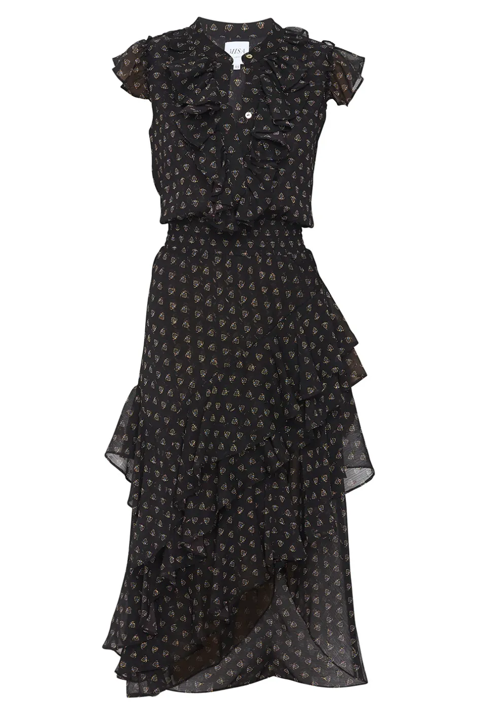 The Ilysa dress epitomizes effortless sophistication Black Lapis Eye printed crinkle chiffon with lurex clip dots. Featuring ruffle-detailed cap sleeves to complement the ruffle trimmed placket with button closure. An elastic smocked waistband leads into an ankle grazing asymmetric skirt with cascading ruffles and side slit.