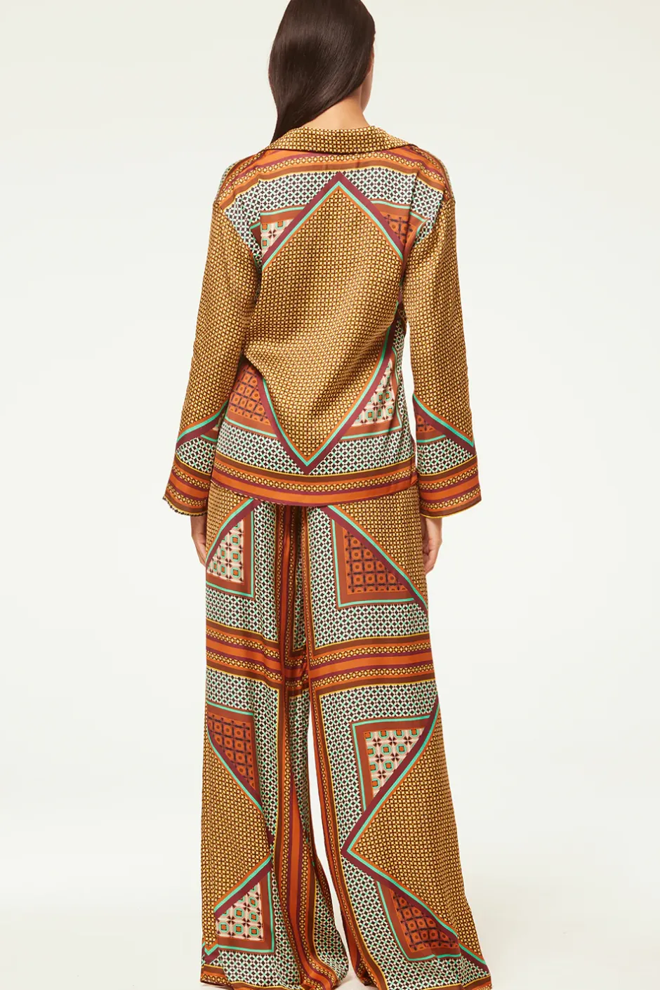 Our Isme blouse is cut from a beautiful Positano Scarf print and features a notched collar and button front. A draped fit with long sleeves leads into a curved hem and split sides. Complete the look with our coordinating Lemor pant or the Elam short.