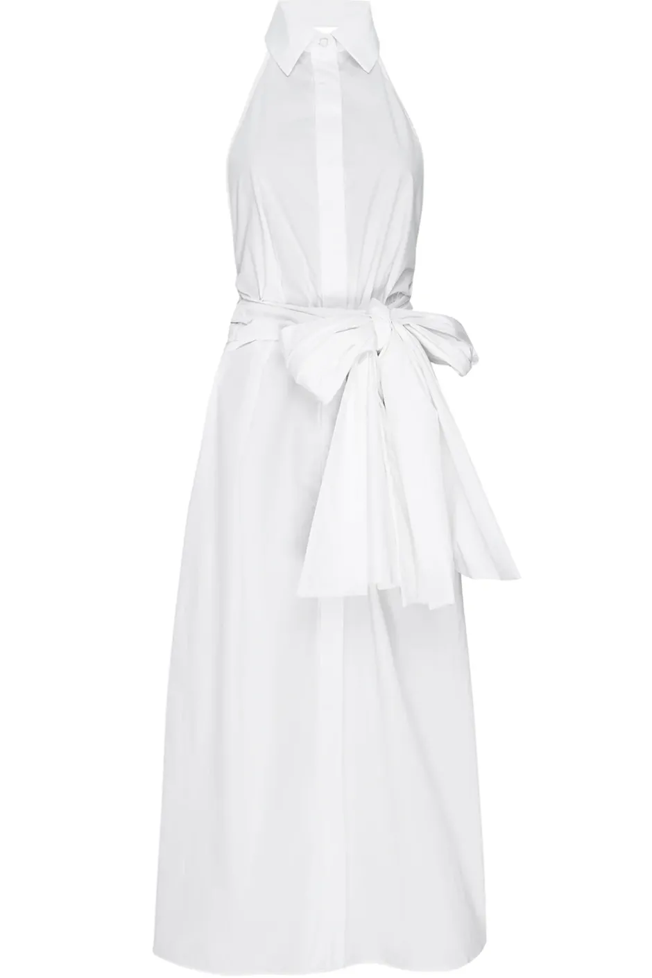 Our new Jessika dress is a midi length silhouette in white cotton poplin. Featuring an open back with an elasticized back strap, a halter neckline and button placket. This sleeveless a-line style features double side slits, a self-tie waist and side slit pockets. The perfect little white dress for Spring and beyond.