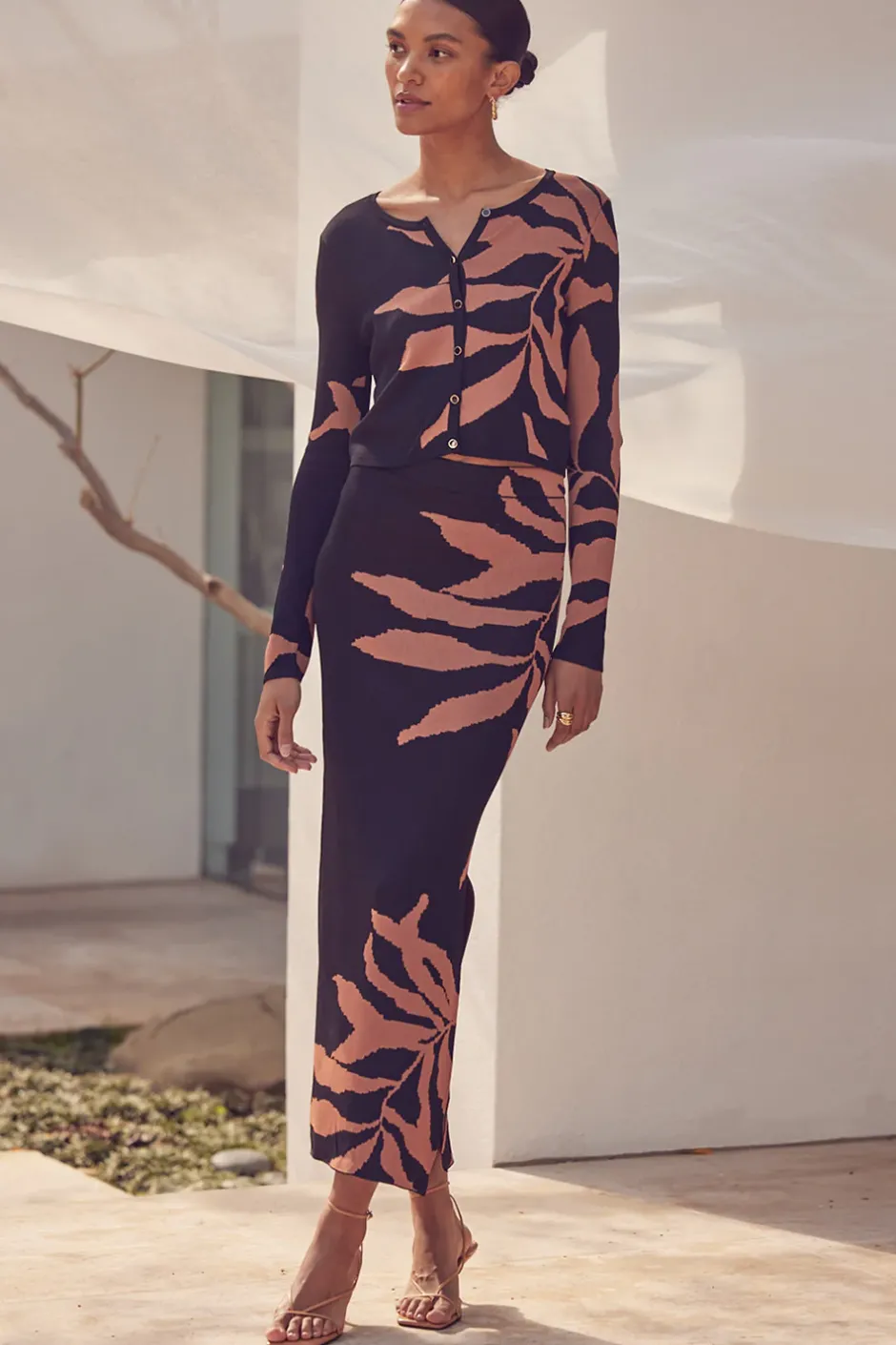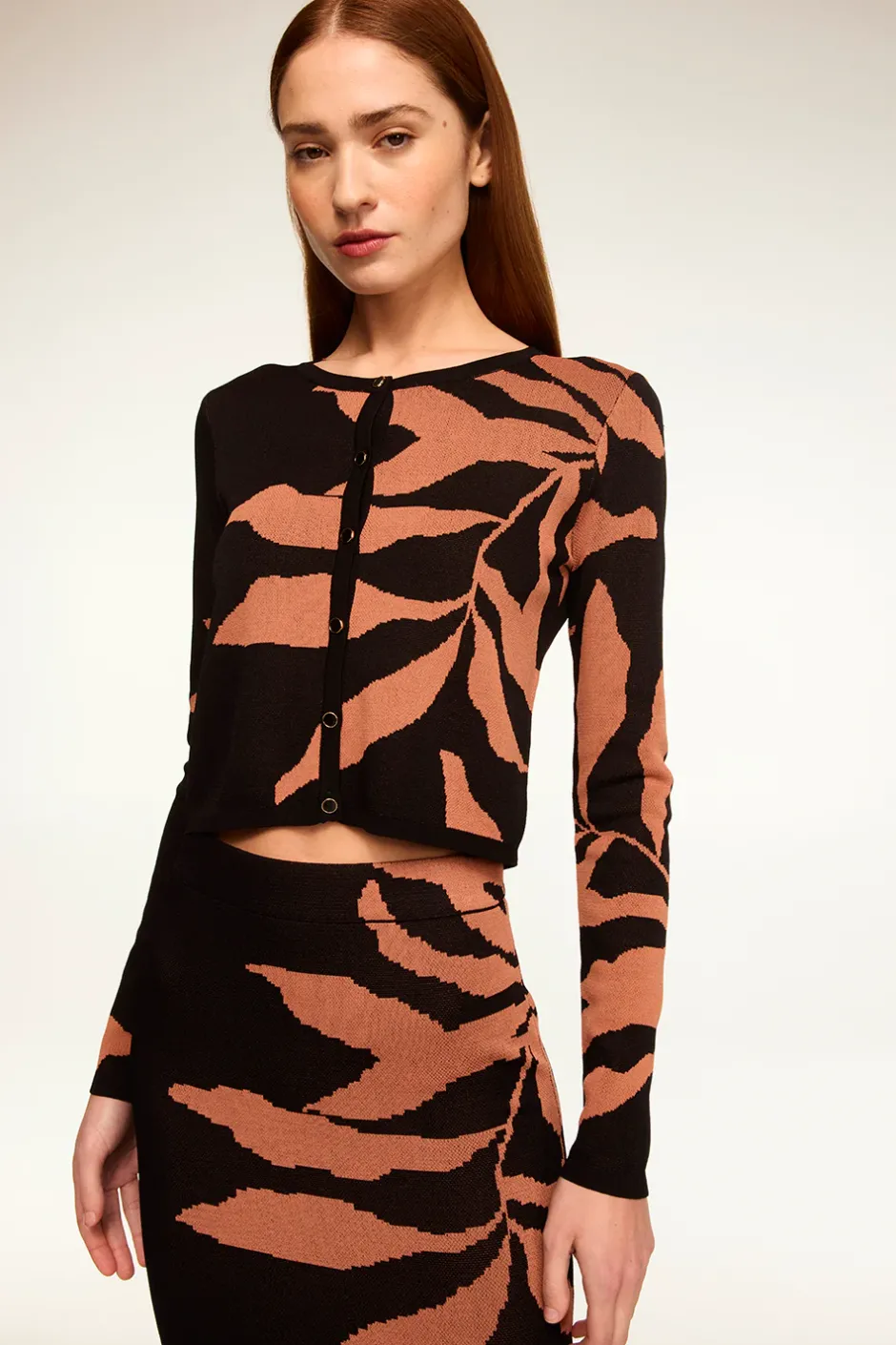 Our Joana cardigan is a beautiful jacquard knit in our Fernal Glow print. A fitted, slightly cropped silhouette fully buttons at the front and is finished with tonal, black enamel buttons. Wear with jeans or pair with the matching Fira skirt.