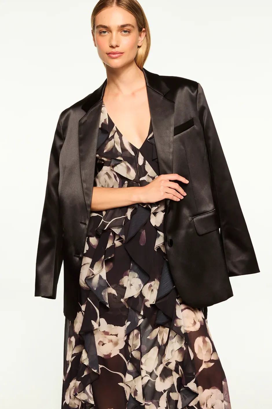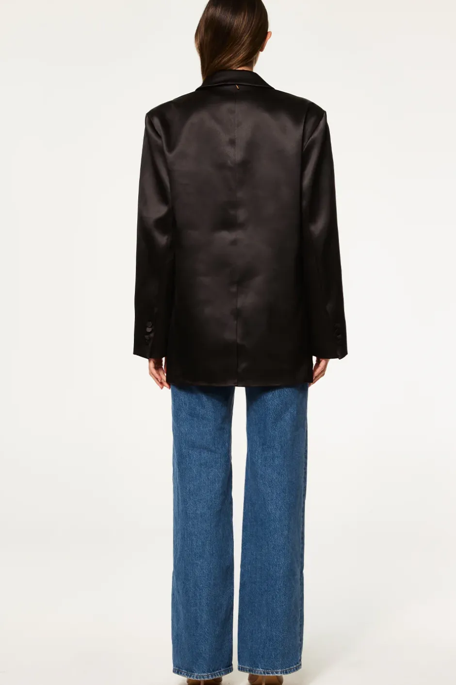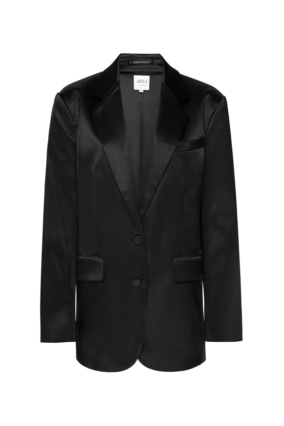 It’s your boyfriend’s tuxedo jacket, but better. The Joanne blazer in black satin is the perfect compliment to all your guest of looks. This oversized blazer features notched lapels and structured wide shoulders. Long sleeves with triple button cuffs and back vent. Double flap front pockets and single chest pocket. Double button front closure. Intentionally oversized so please size down.