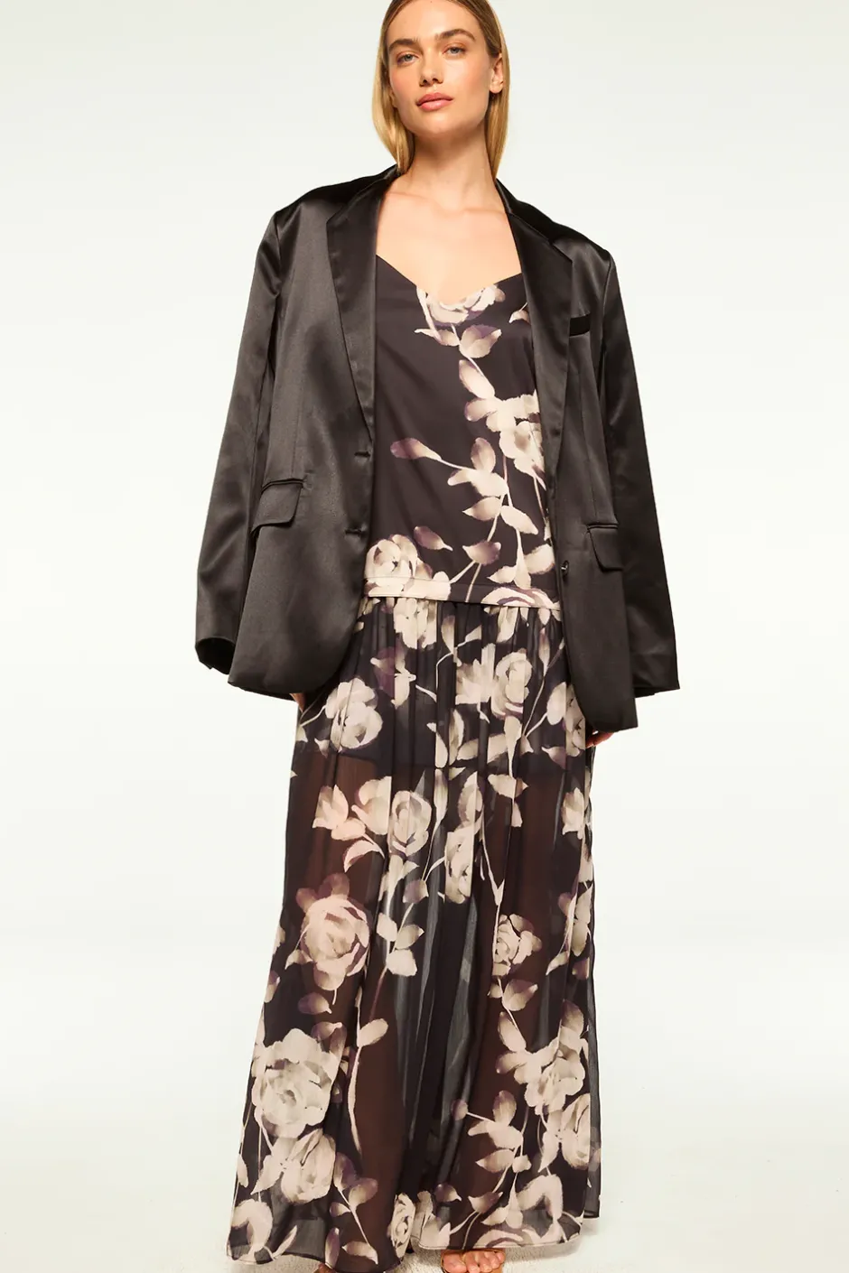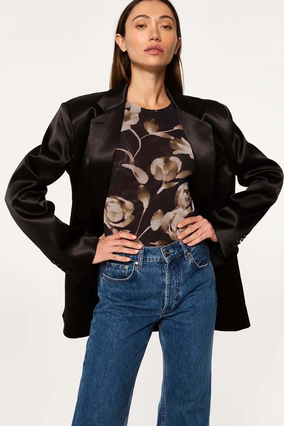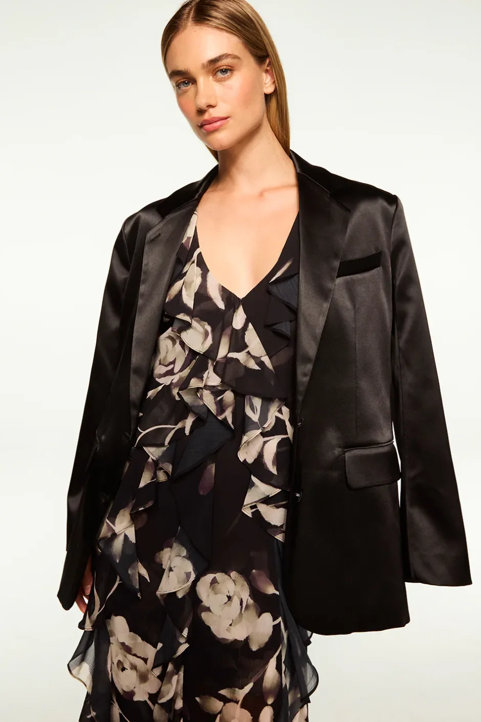 It’s your boyfriend’s tuxedo jacket, but better. The Joanne blazer in black satin is the perfect compliment to all your guest of looks. This oversized blazer features notched lapels and structured wide shoulders. Long sleeves with triple button cuffs and back vent. Double flap front pockets and single chest pocket. Double button front closure. Intentionally oversized so please size down.
