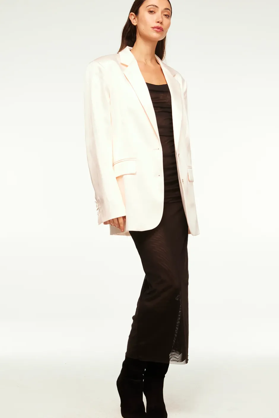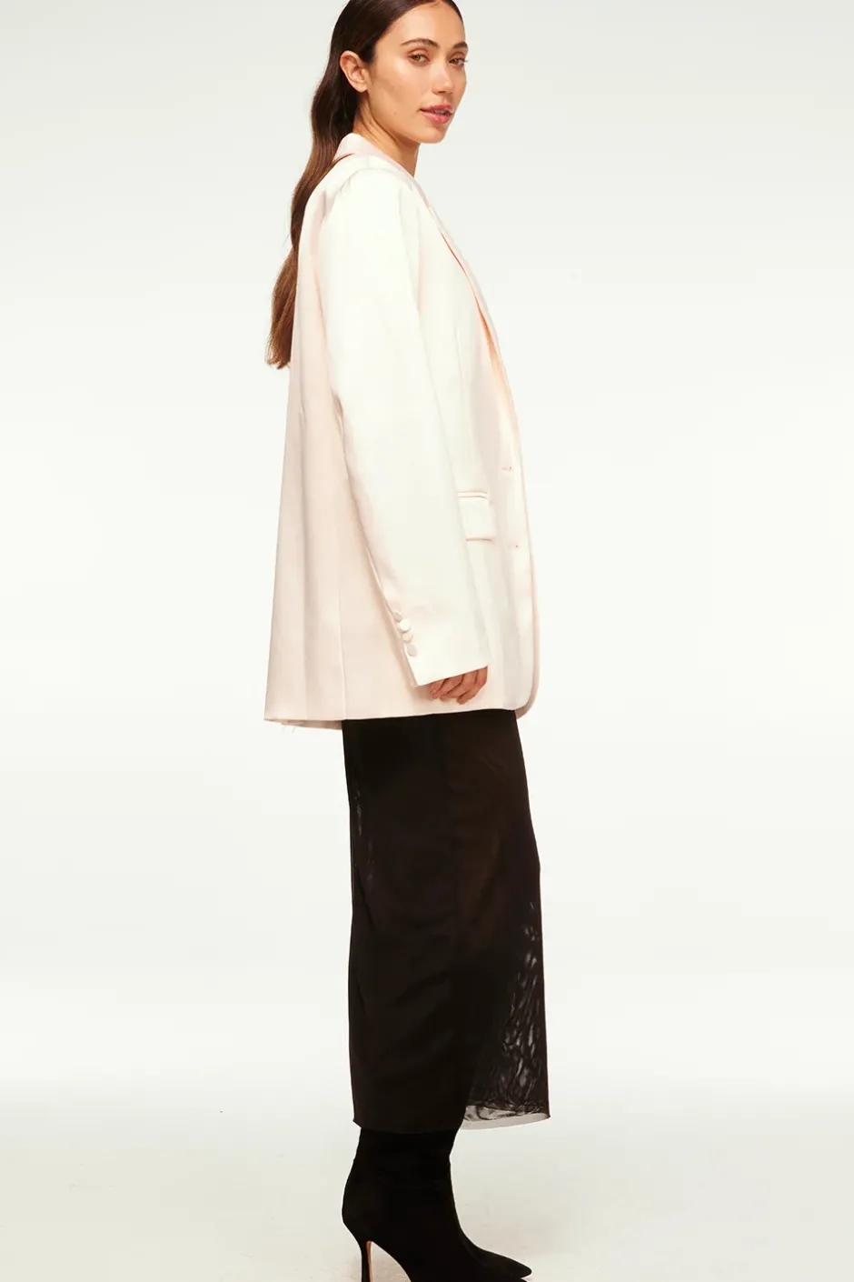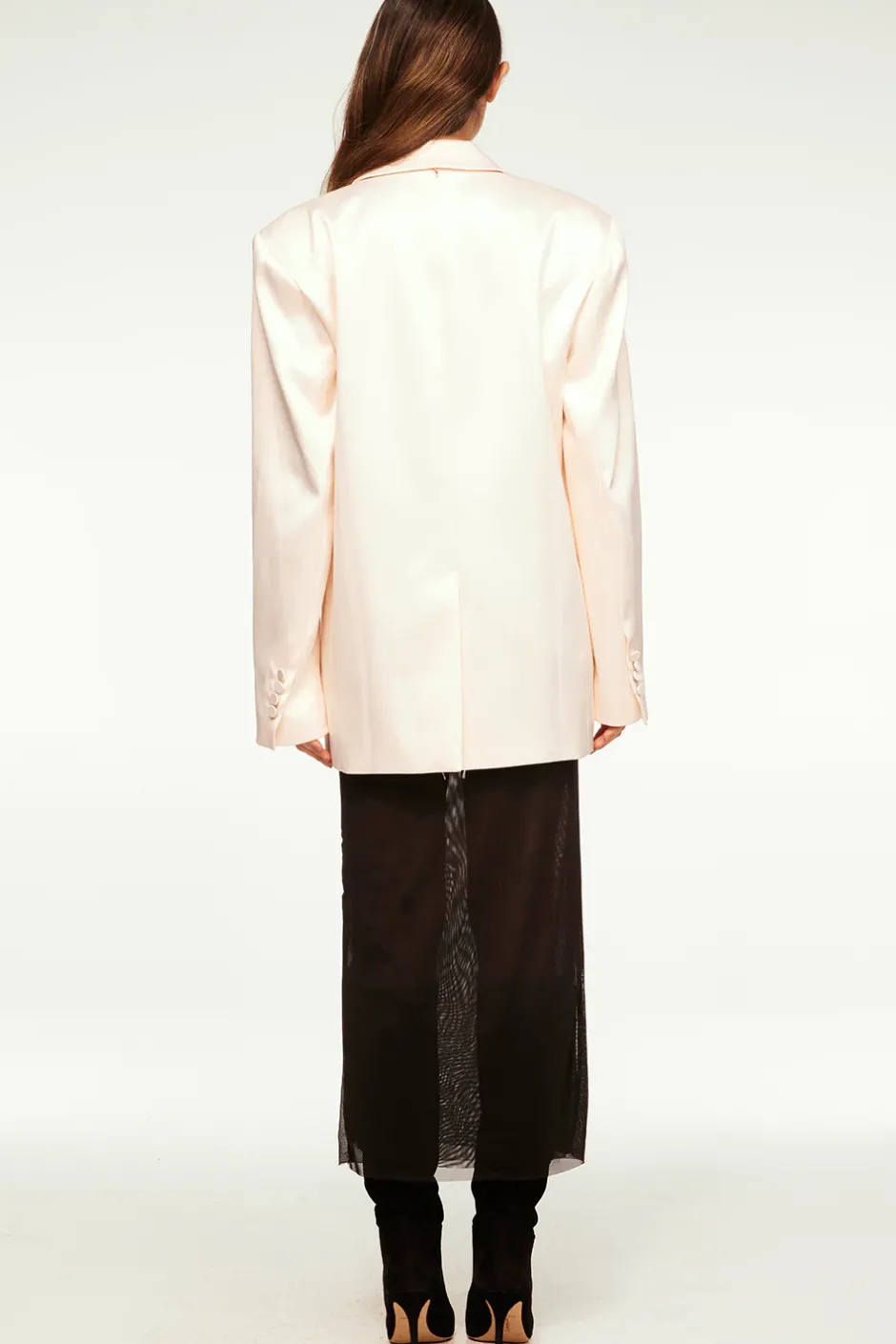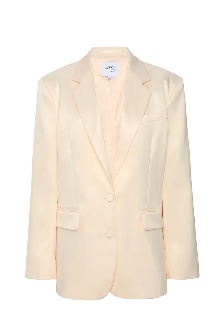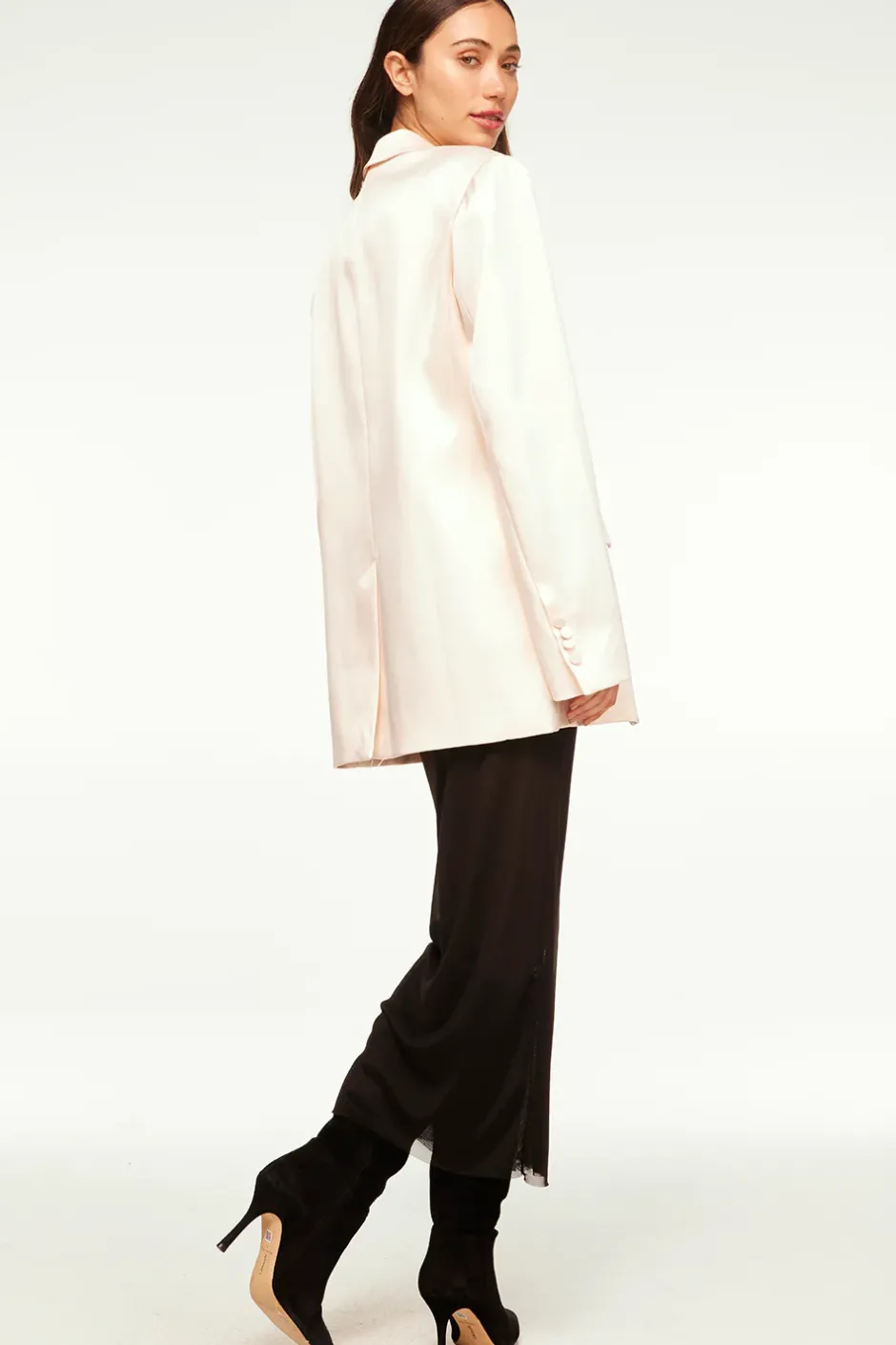 It’s your boyfriend’s tuxedo jacket, but better. The Joanne blazer in a whisper pink/ivory satin is the perfect compliment to all your looks this holiday season. This oversized blazer features notched lapels and structured wide shoulders. Long sleeves with triple button cuffs and back vent. Double flap front pockets and single chest pocket. Double button front closure. Intentionally oversized so please size down.