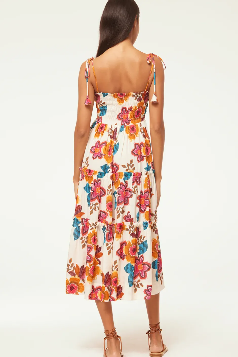Our new Kamina dress is an easy Summer silhouette cut from a vibrant Flora Marbella print linen blend. A fitted smocked bodice with tie petal tassel spaghetti straps leads into a midi length tiered skirt with side slit pockets. This lovely day dress pairs perfectly with everything from sandals to ballet flats.