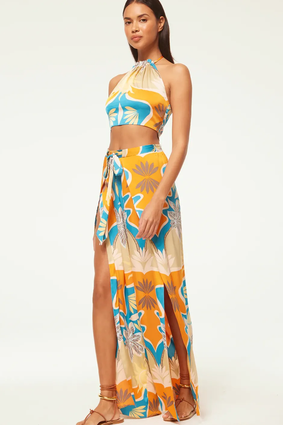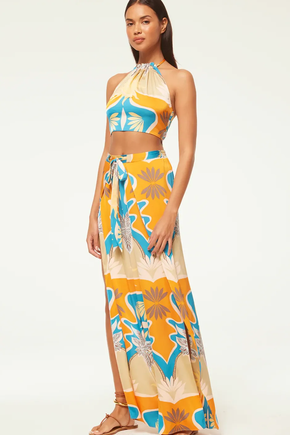 Our new Kanna pant gives a sarong effect with a faux wrap detail and tie waist with a covered elastic back. Cut from a gorgeous Bain De Soleil printed satin, these getaway ready pants feature wide legs with side slit details to the mid thigh. Pair with the coordinating Luan top for the perfect beach to bar look.