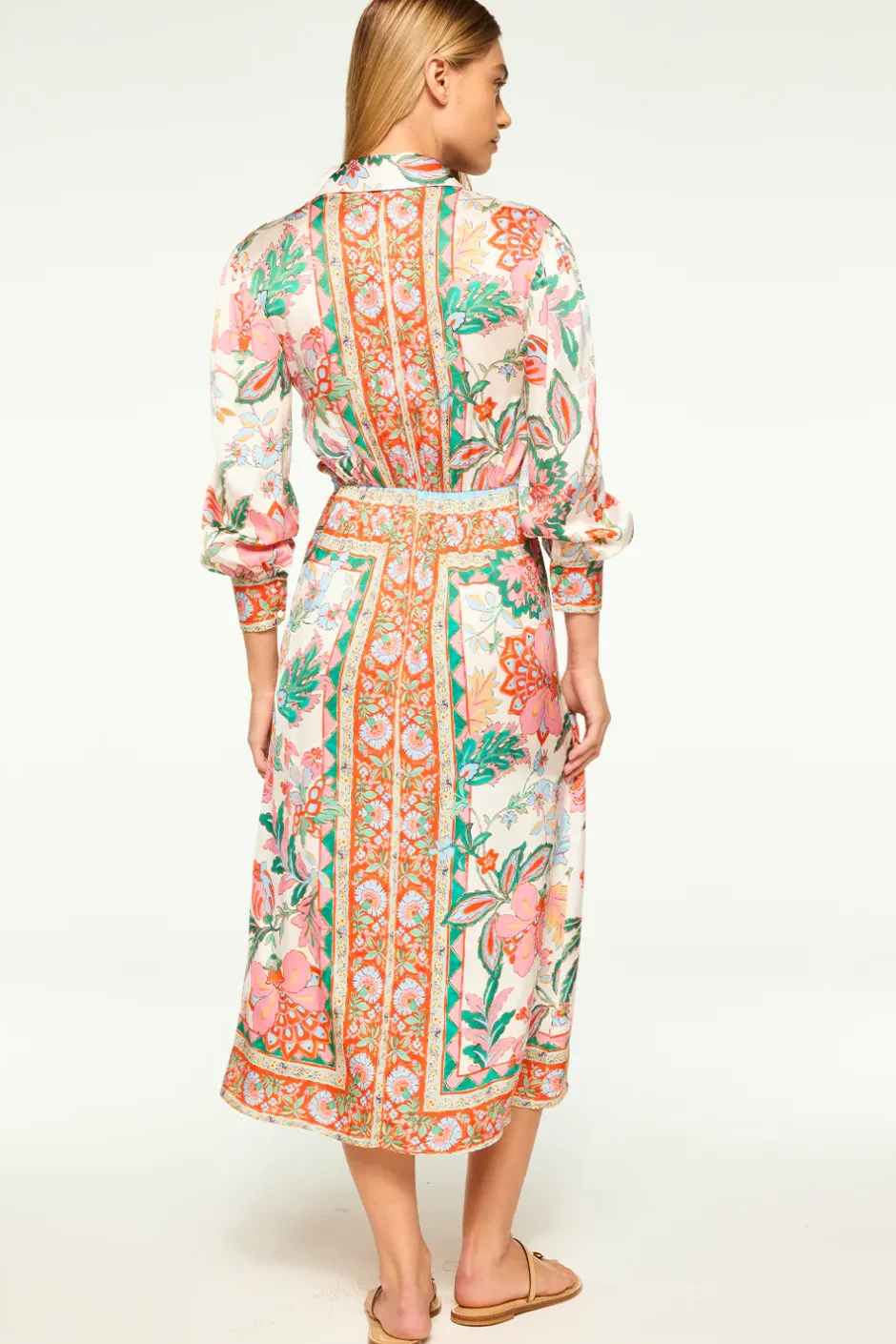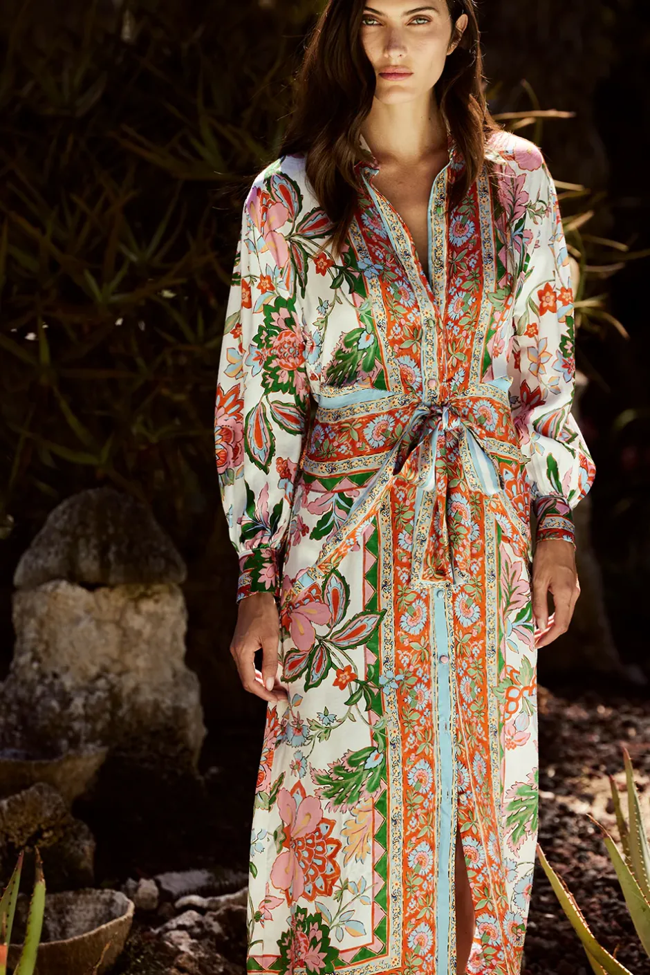 Our new Kasbah dress is a gorgeous midi shirtdress cut from our Casablanca Floral satin. A front tie cinches the waist. Spread collar with button front and three-quarter length sleeves finished with button cuffs. This a-line silhouette falls below the knee. Pair this sophisticated style with everything from heels to flats.