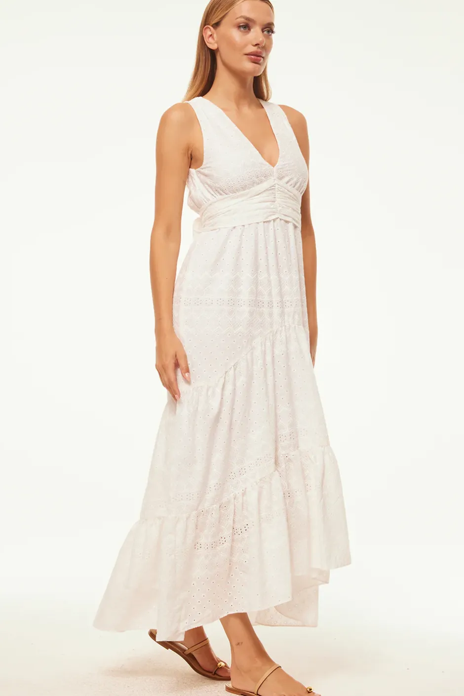 Embrace elegant femininity in the Ksenia dress, a versatile maxi featuring a deep v-neckline and flattering wrap-around belt with an open back that ties at the waistline. An a-line silhouette with hidden side zip closure. A geometric heart motif and eyelet details finish off this timeless style you’ll turn to for seasons to come.