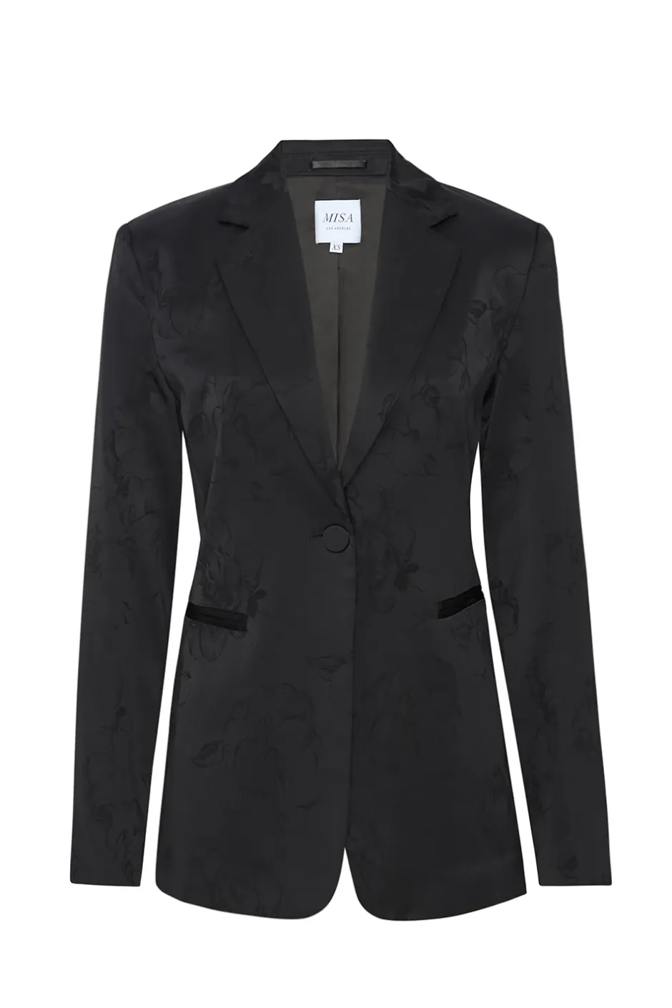Our new Lauren blazer is cut from a black satin jacquard with floral tonal detailing throughout. This fitted blazer is the perfect transitional piece for fall. A v neckline with notch lapels and a single covered button closure. Double front slit pockets. Structured shoulders. Long sleeves with triple covered button closure. Back vent. Complete the look with the coordinating Remi pant for the chicest fall suiting or throw on over one of our dresses.