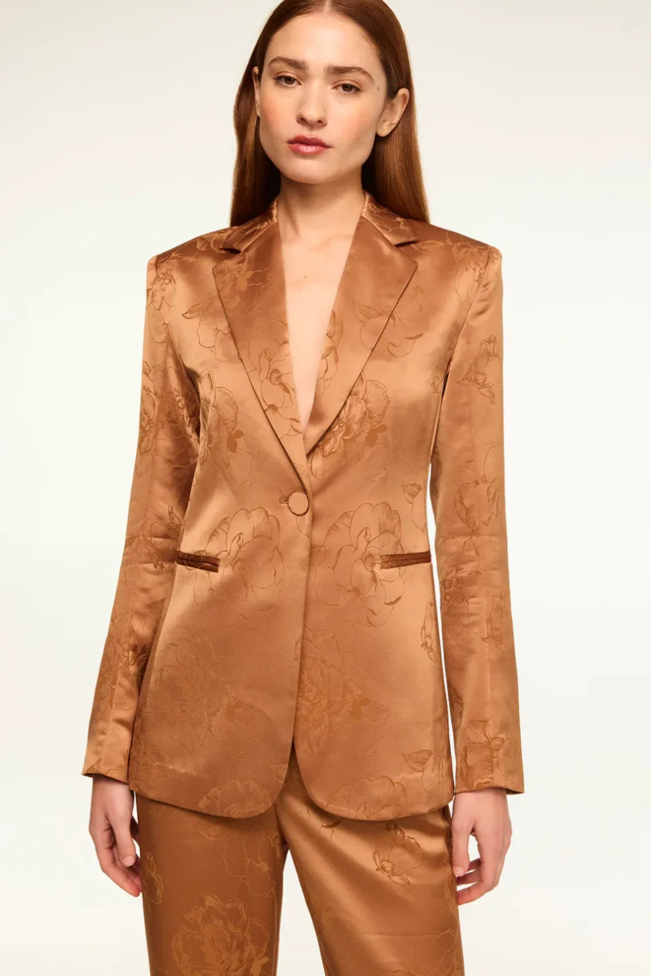 Our new Lauren blazer is cut from a camel satin jacquard with floral tonal detailing throughout. This fitted blazer is the perfect transitional piece for fall. A v neckline with notch lapels and a single covered button closure. Double front slit pockets. Structured shoulders. Long sleeves with triple covered button closure. Back vent. Complete the look with the coordinating Remi pant for the chicest fall suiting or throw on over one of our dresses.