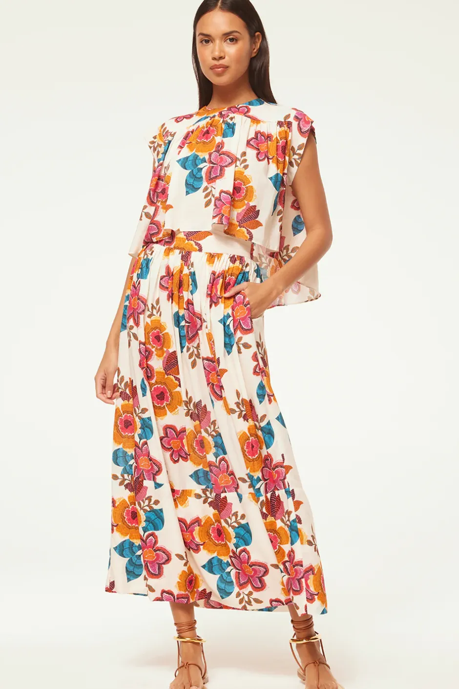 Our newest ankle grazing maxi skirt is cut from a rayon linen blend in a vibrant Flora Marbella print. Featuring flattering pleats, wide band hem, double side slit pockets and hidden side zip closure. Pair with the coordinating Alina top for a eye-catching Summer set.
