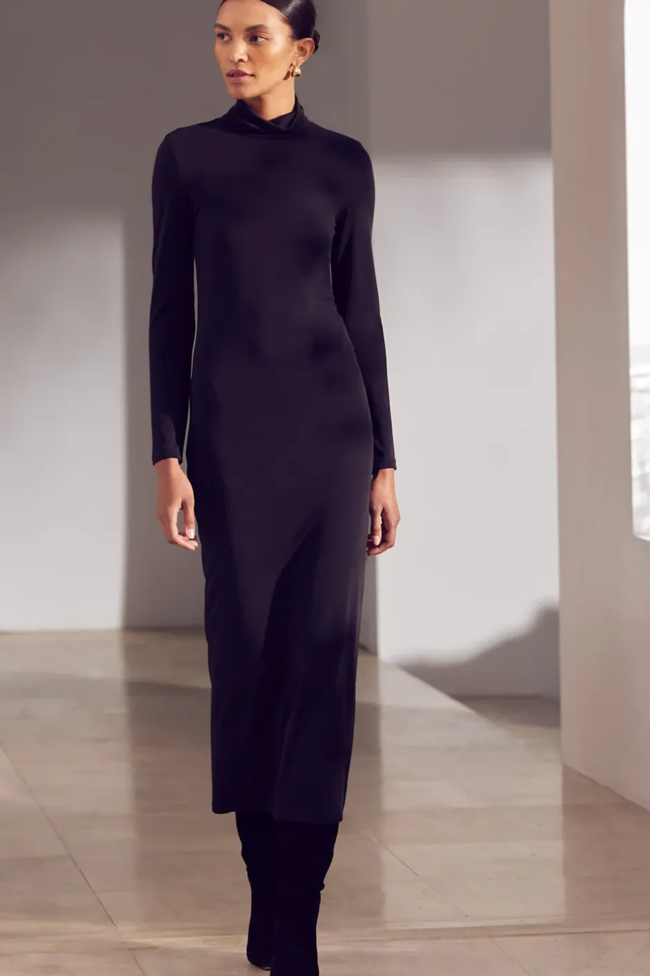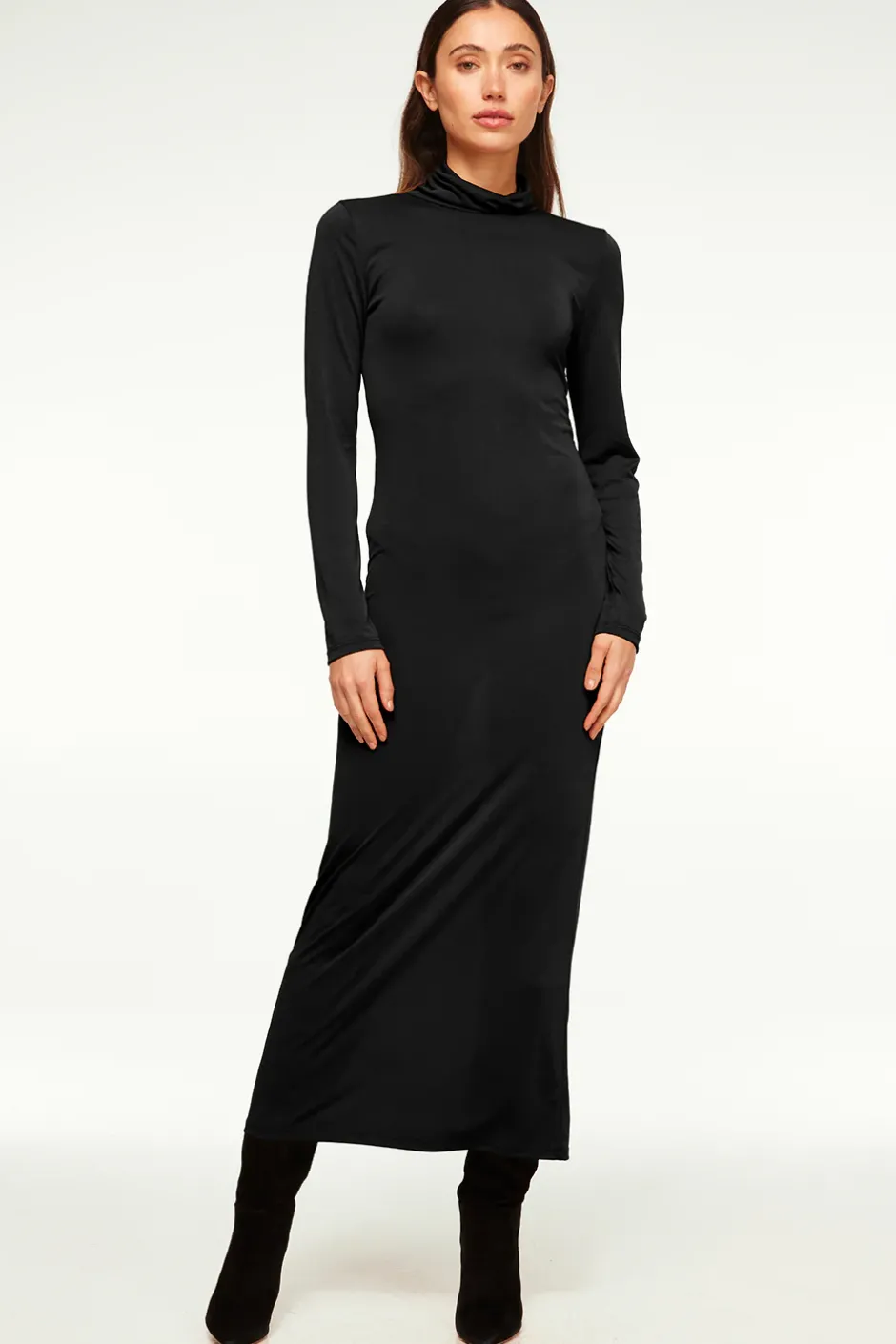 The Liv dress is a figure-hugging maxi turtleneck dress cut from the softest black modal fabric. A wardrobe staple to pair with your favorite fall jackets and blazer. This versatile style can be paired with flats or boots for the perfect transitional style.