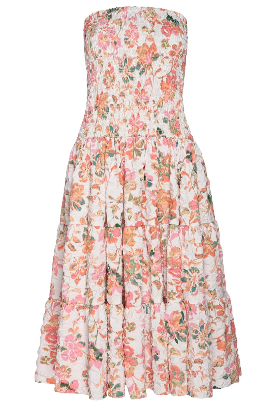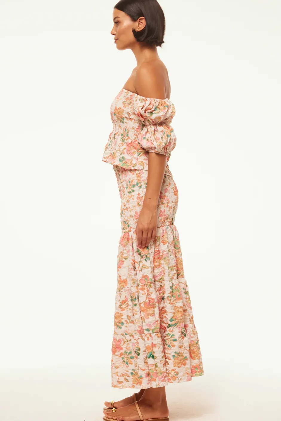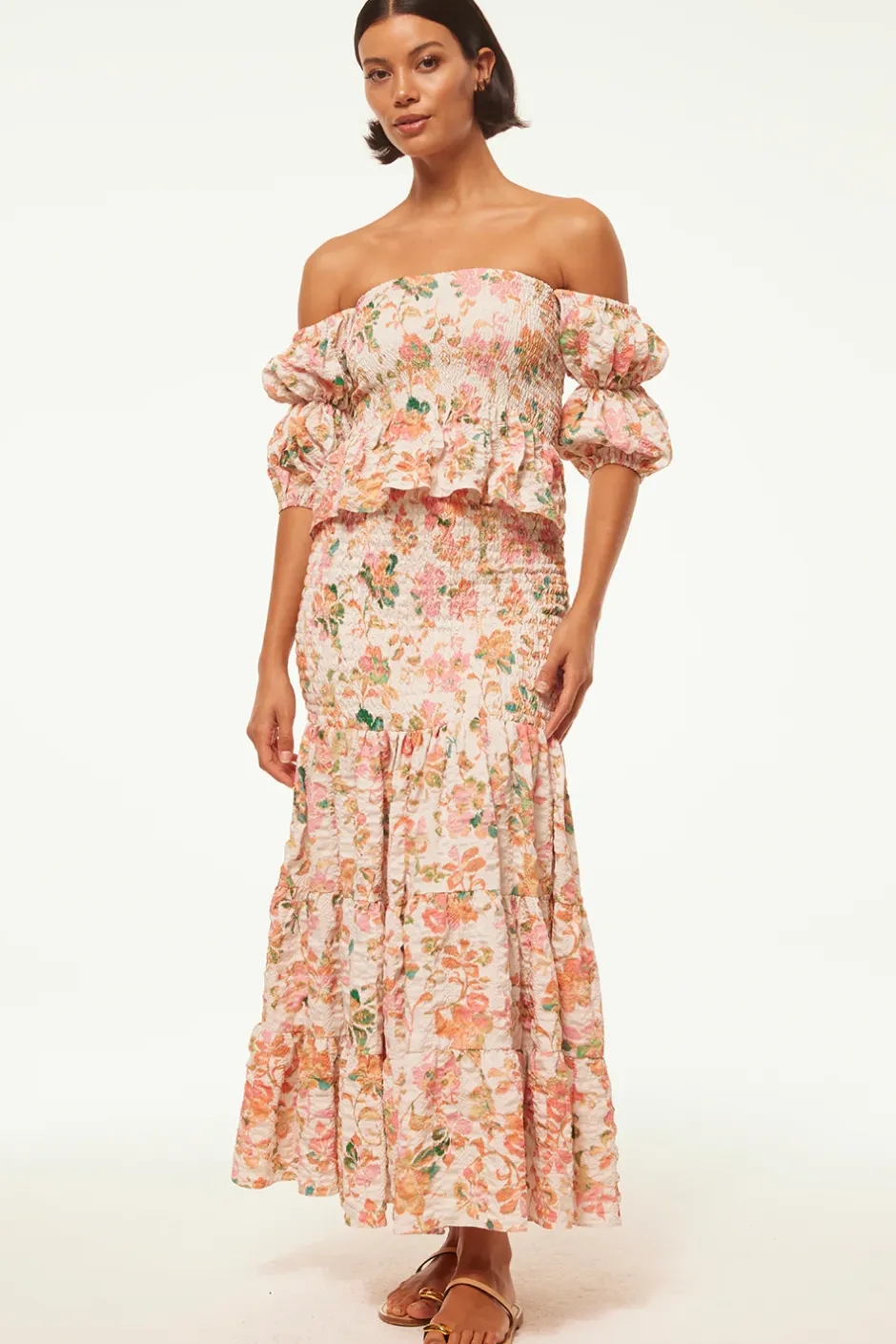 Our new Lola Convertible is an effortless addition to your wardrobe. Featuring a wide elastic shirred waist, this versatile piece cut in a persimmon floral crinkle fabrication can be worn as a chic strapless dress or as a skirt paired with our coordinating Vida top.