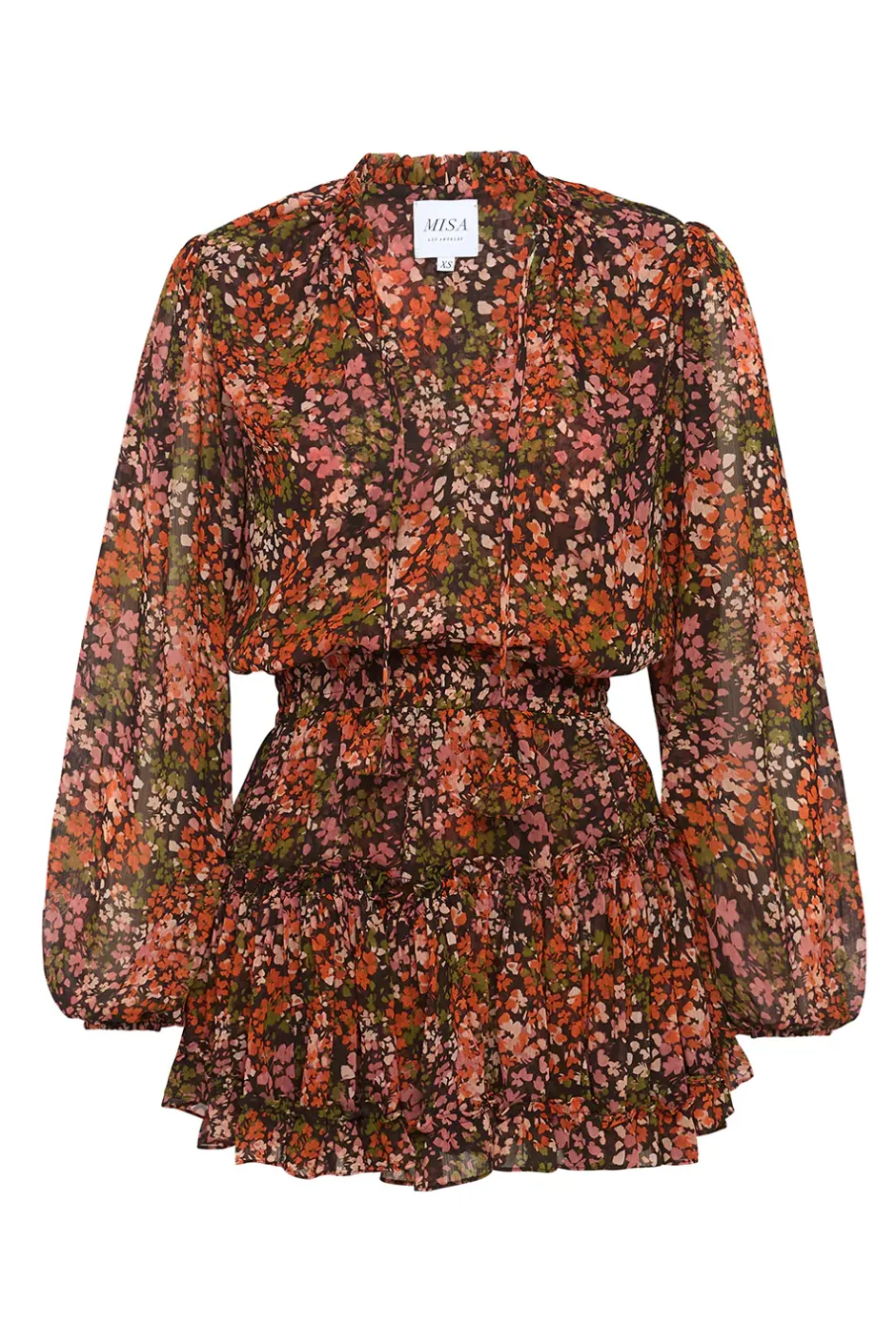 A classic style handcrafted from an effortless Autumn Flora print chiffon. Featuring a split neck opening with our signature petal string ties, this playful long sleeve mini dress is double-lined throughout with an elastic waist and a tiered skirt. Pair with suede boots for the cooler months ahead.
