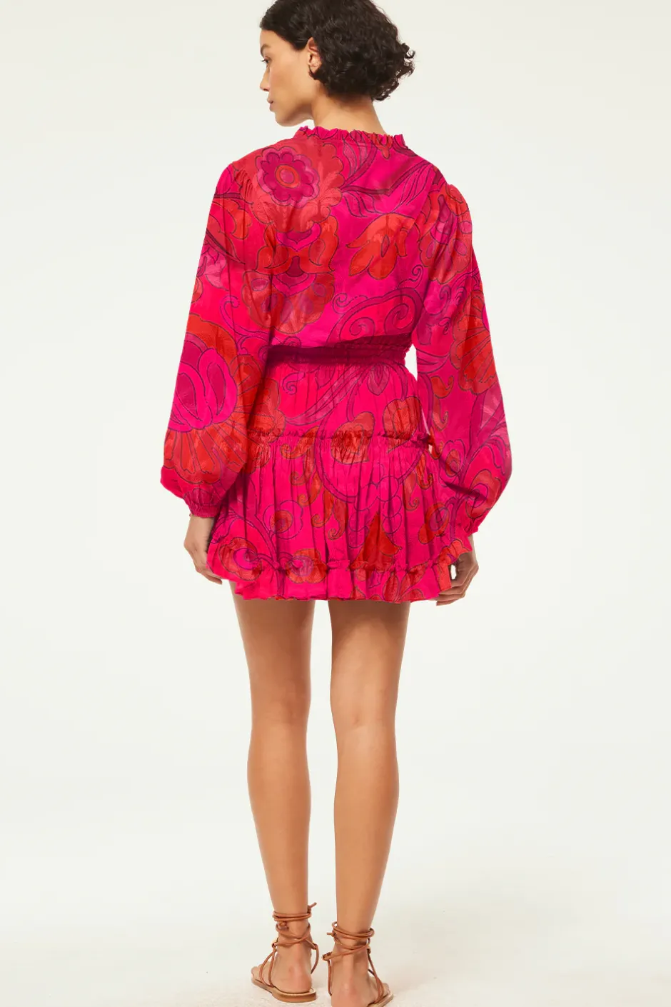 A classic MISA style handcrafted from a vibrant fuchsia Flora Corsica printed satin. Featuring a split neck opening with our signature petal string ties, this playful long sleeve mini dress features a smocked elastic waist and tiered mini skirt.