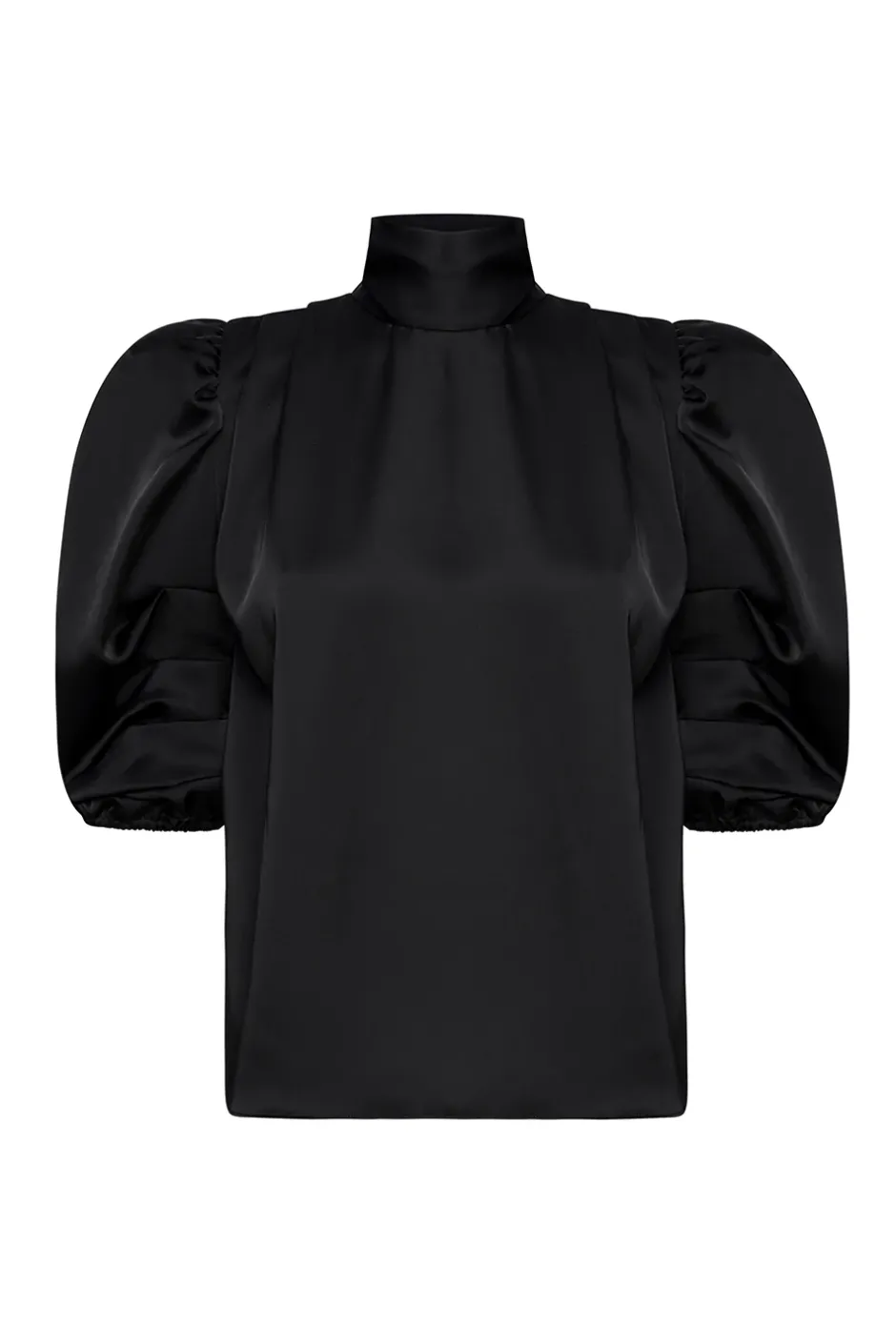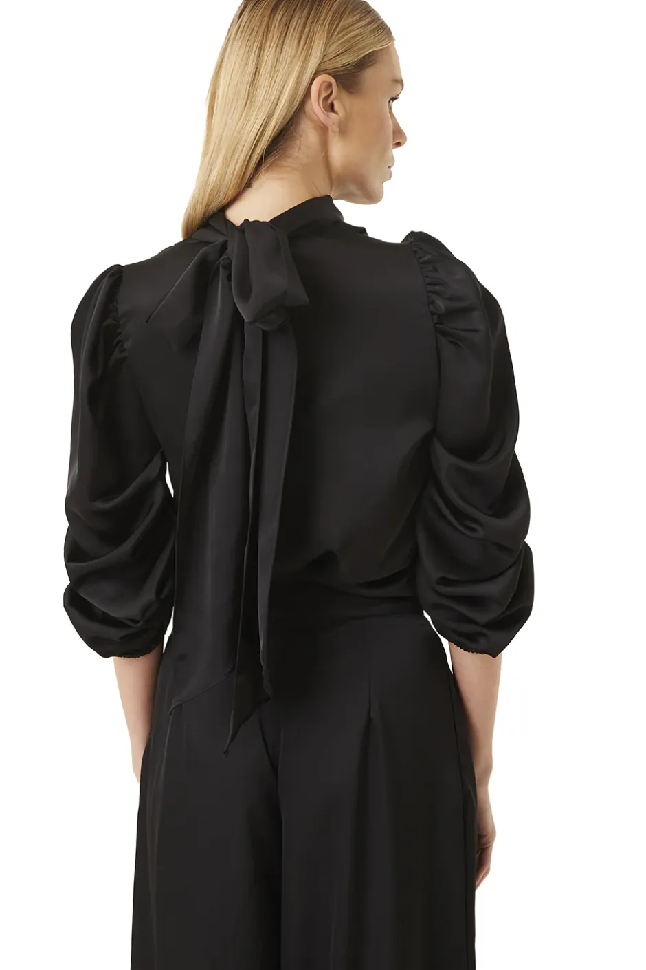 Our new Luella top is soon to be a wardrobe staple. Cut from the silkiest satin, it features a sophisticated high mock neck finished off with a tie closure. Gathered at the shoulder and featuring three-quarter ruched blouson sleeves. Pair this top with the coordinating Filippa pant for a chic set or dress down with a pair of jeans.