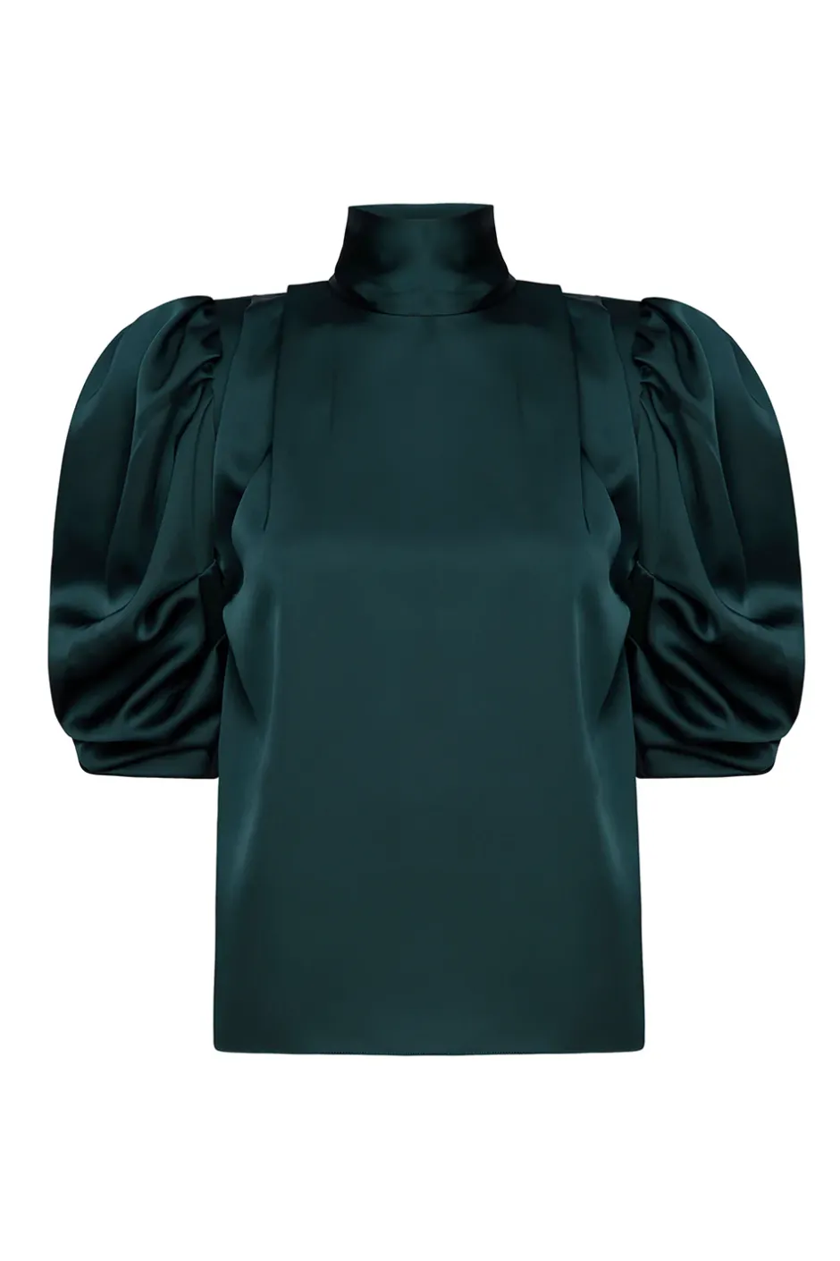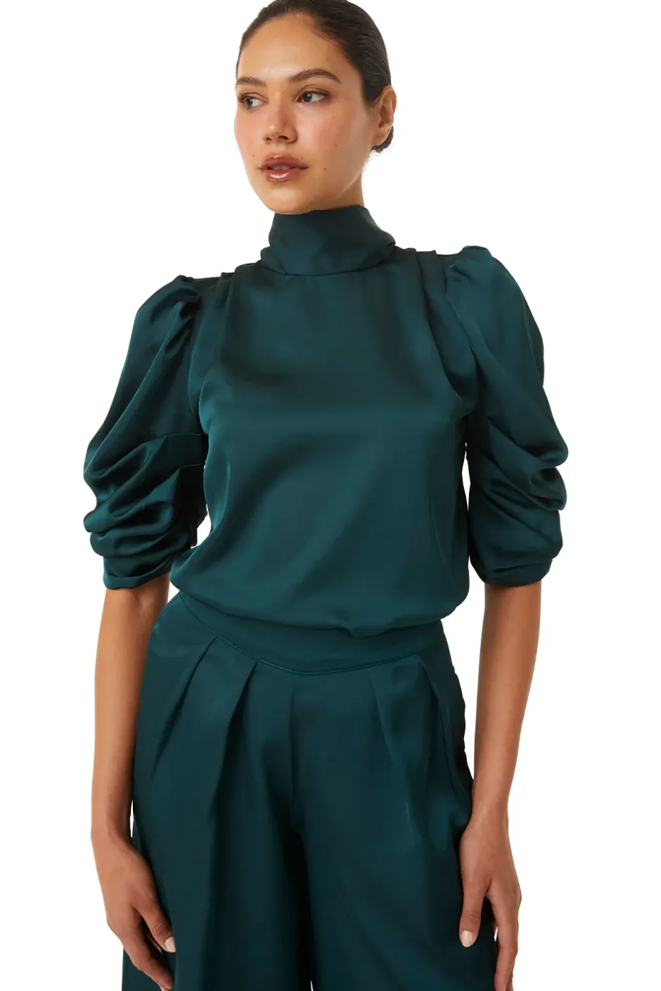 Our new Luella top is soon to be a wardrobe staple. Cut from the silkiest emerald satin, it features a sophisticated high mock neck finished off with a tie closure. Gathered at the shoulder and featuring three-quarter ruched blouson sleeves. Pair this top with the coordinating Filippa pant for a chic set or dress down with a pair of jeans.