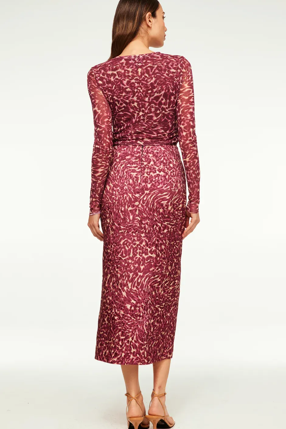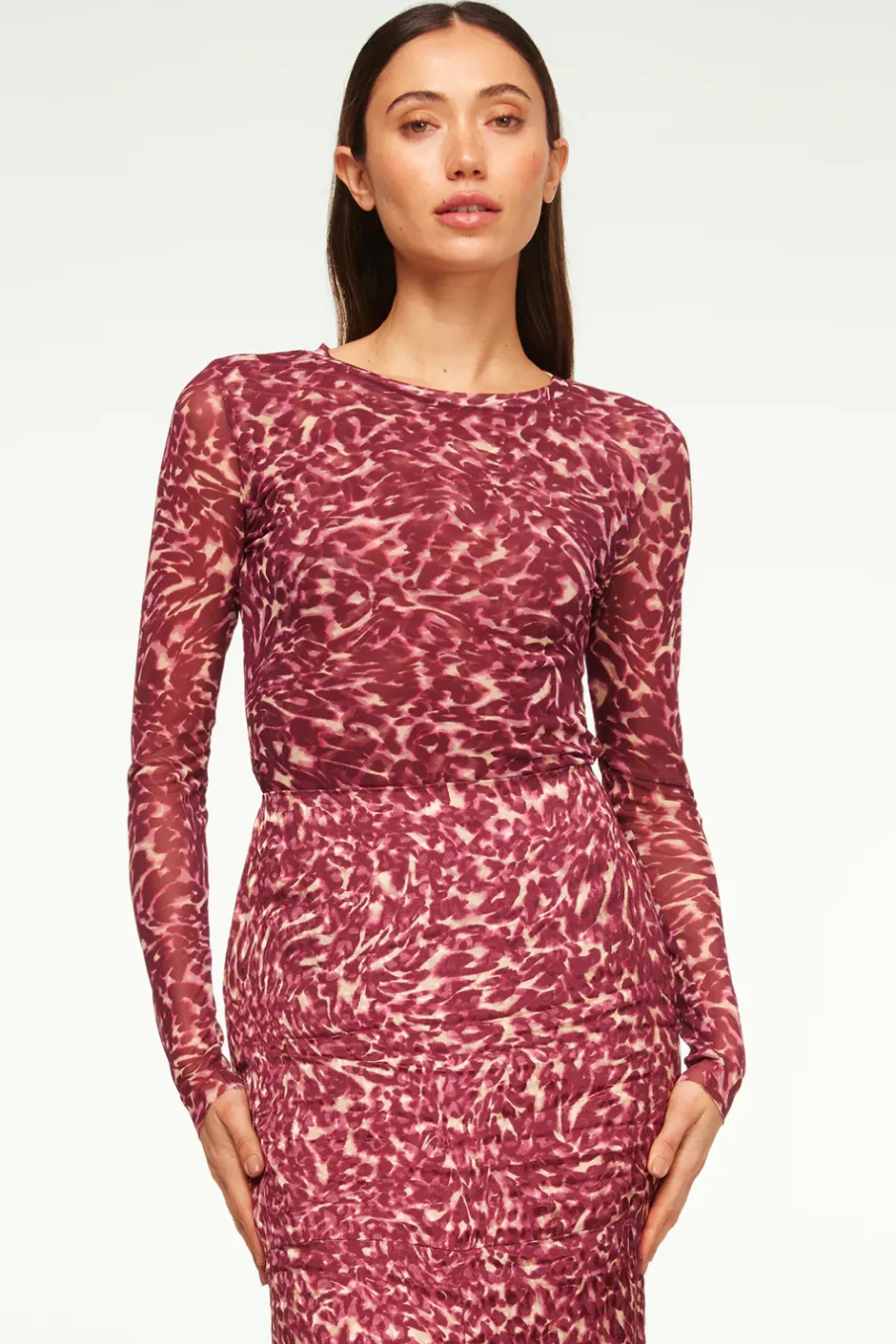 Our new Lula top is a long sleeve, fitted silhouette cut from an on-trend fuchsia leopard print mesh. The body is double lined and the sleeves are sheer. Crew neckline. Pair with the coordinating Ivan skirt for a standout set or with your favorite pair of jeans.