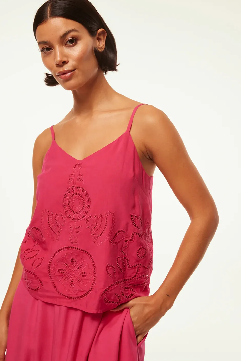 Marcela is an easy cotton camisole top in a vibrant pink hue. Featuring a gorgeous hand embroidered floral eyelet motif and adjustable spaghetti straps. Pair this piece with everything from denim to the coordinating Analisse skirt.